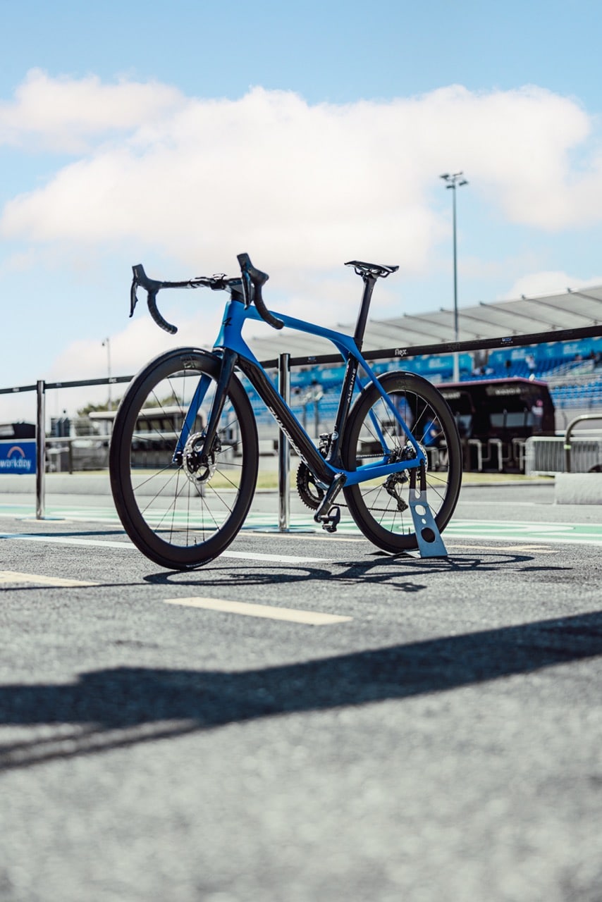 En ce qui concerne la transmission de ce vélo, elle est assurée par le groupe de la marque japonaise Shimano. C’est un Dura-Ace Di2 à 12 vitesses qui prend place sur ce vélo. Le freinage est aussi assuré par des étriers et disques Shimano Dura-Ace. Enfin, l’utilisation de carbone est omniprésente puisque le cadre, le guidon, la potence ou encore même la tige de selle sont dans ce matériau léger et rigide, deux qualités essentielles pour un vélo de compétition. Enfin, les roues sont elles aussi en carbone avec des pneus Grand Prix 5000S de la marque Continentale. Définitivement deux mondes proches l’un de l’autre.
