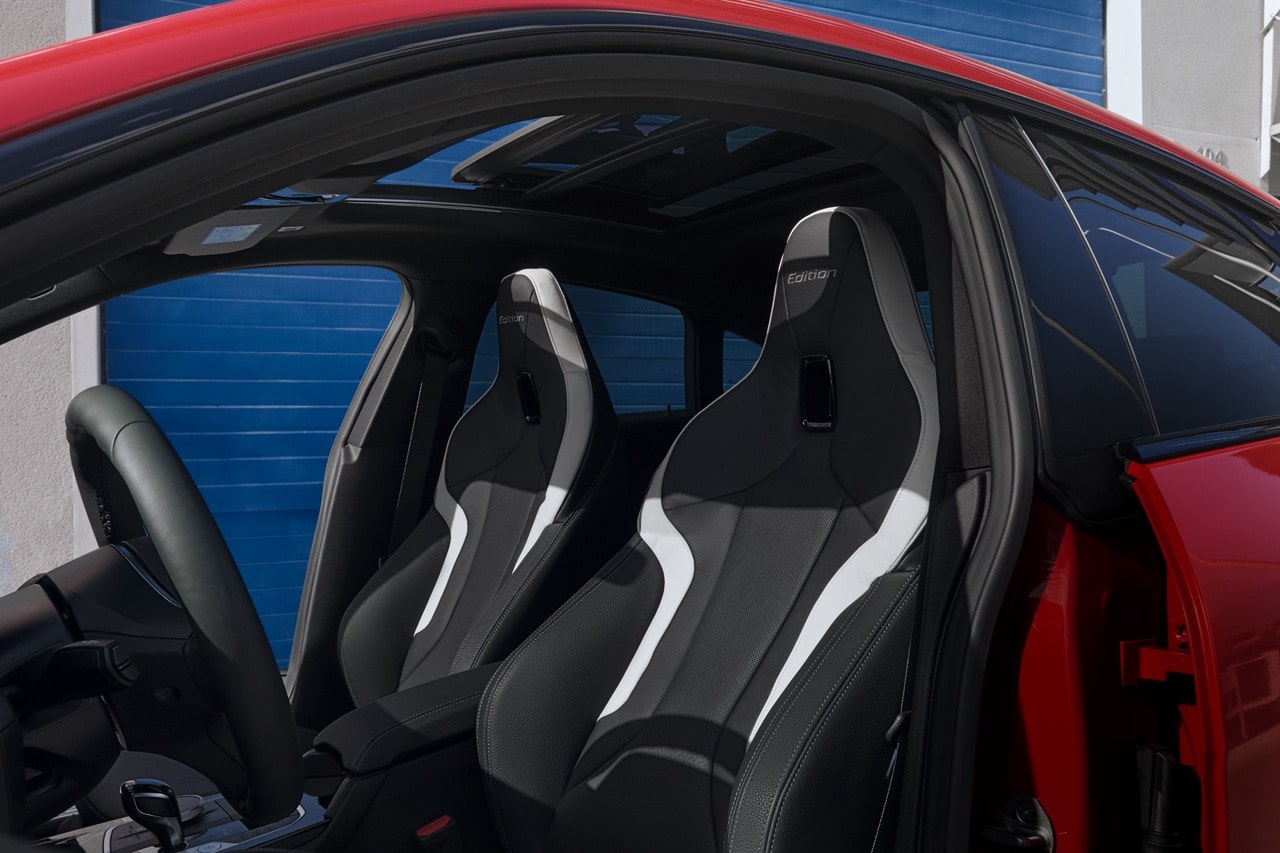 Pour cette Édition M Sport Pro, BMW donne aux habitacles de BMW Série 1 et Série 2 Grand Coupé des détails exclusifs. Ainsi, ils sont équipés d’une sellerie Dakota spéciale bi-ton noir et rouge (Schwarz/Rot) ou noir et crème (Schwarz/Ivory). Un blason est apposé sur ces sièges avant au maintien amélioré.