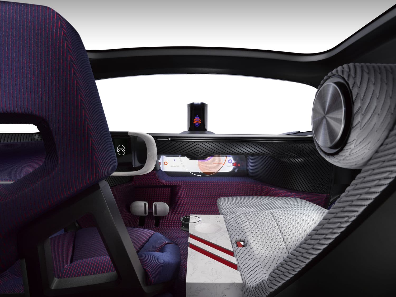 L’habitacle a été conçu comme un salon. Le passager avant est d’ailleurs carrément installé sur une méridienne. A l’arrière, Citroën parle d’un sofa plutôt que d’une banquette. Les appuie-têtes sont remplacés par un treillis d’élastiques. La planche de bord est épurée. Face au passager, une zone vitrée peut se transformer en grand écran. Au centre, un élément cylindrique intrigue : c’est l’Assistant Personnel, qui gère les interactions à bord. Centre névralgique du véhicule, le système est doté d’une intelligence artificielle, capable de deviner les besoins et les envies des passagers.