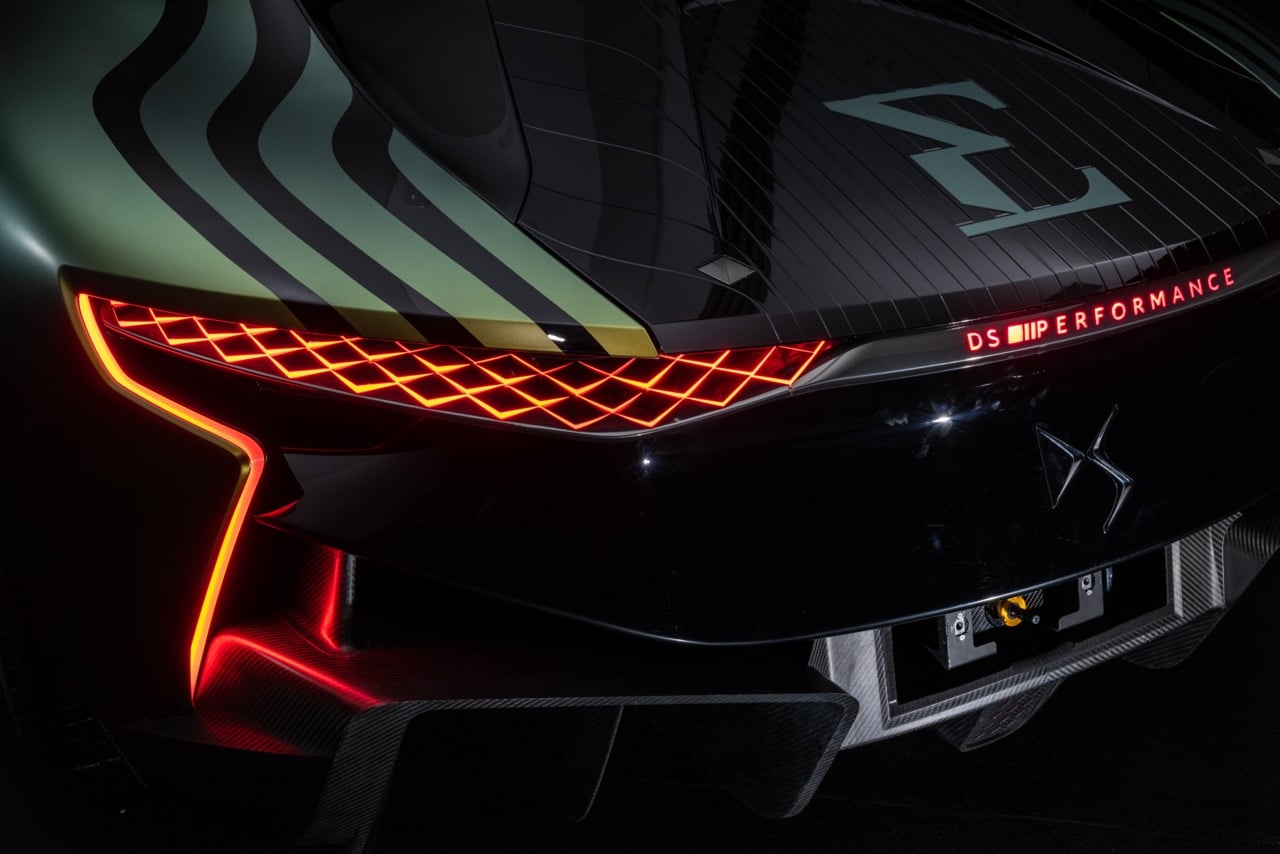 Les jantes sont de 21 pouces et au dessin singulier qui a pour but de réduire le coefficient de pénétration dans l’air. Le carbone se retrouve à plusieurs endroits sur cette DS E-TENSE PERFORMANCE, sur les extracteurs d’air des ailes avant, mais aussi sur l’impressionnant diffuseur arrière. Ce même diffuseur intègre un projecteur antibrouillard arrière dérivé de la monoplace électrique. Les feux arrière sont réussis et ont un design saisissant.