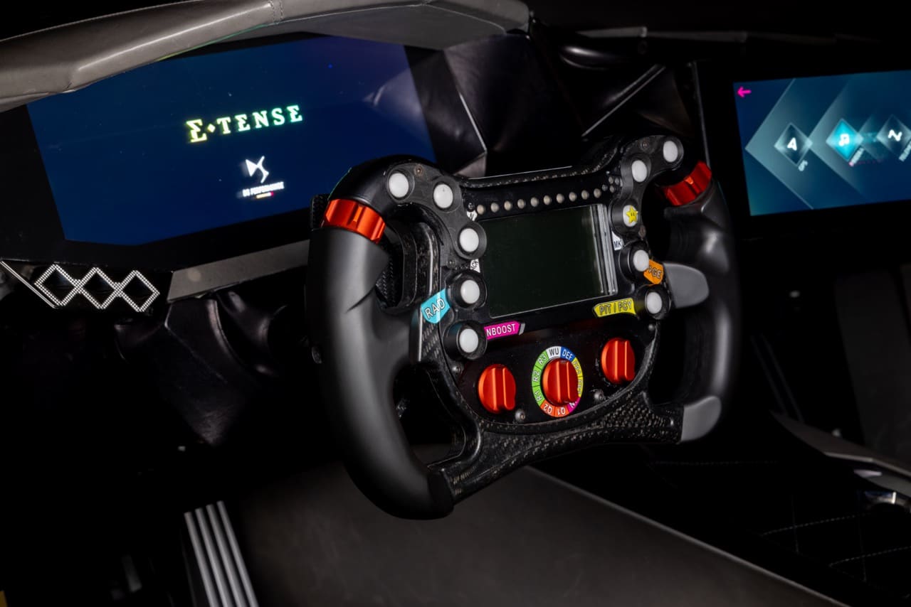 Le carbone se retrouve à profusion aussi à l’intérieur. Les sièges baquets sont faits d’une pièce de ce matériau composite sur lequel sont disposés de maigres morceaux d’habillages pour offrir un minimum de confort. Le volant est ni plus ni moins que celui de la Formula E, encore un signe de filiation.