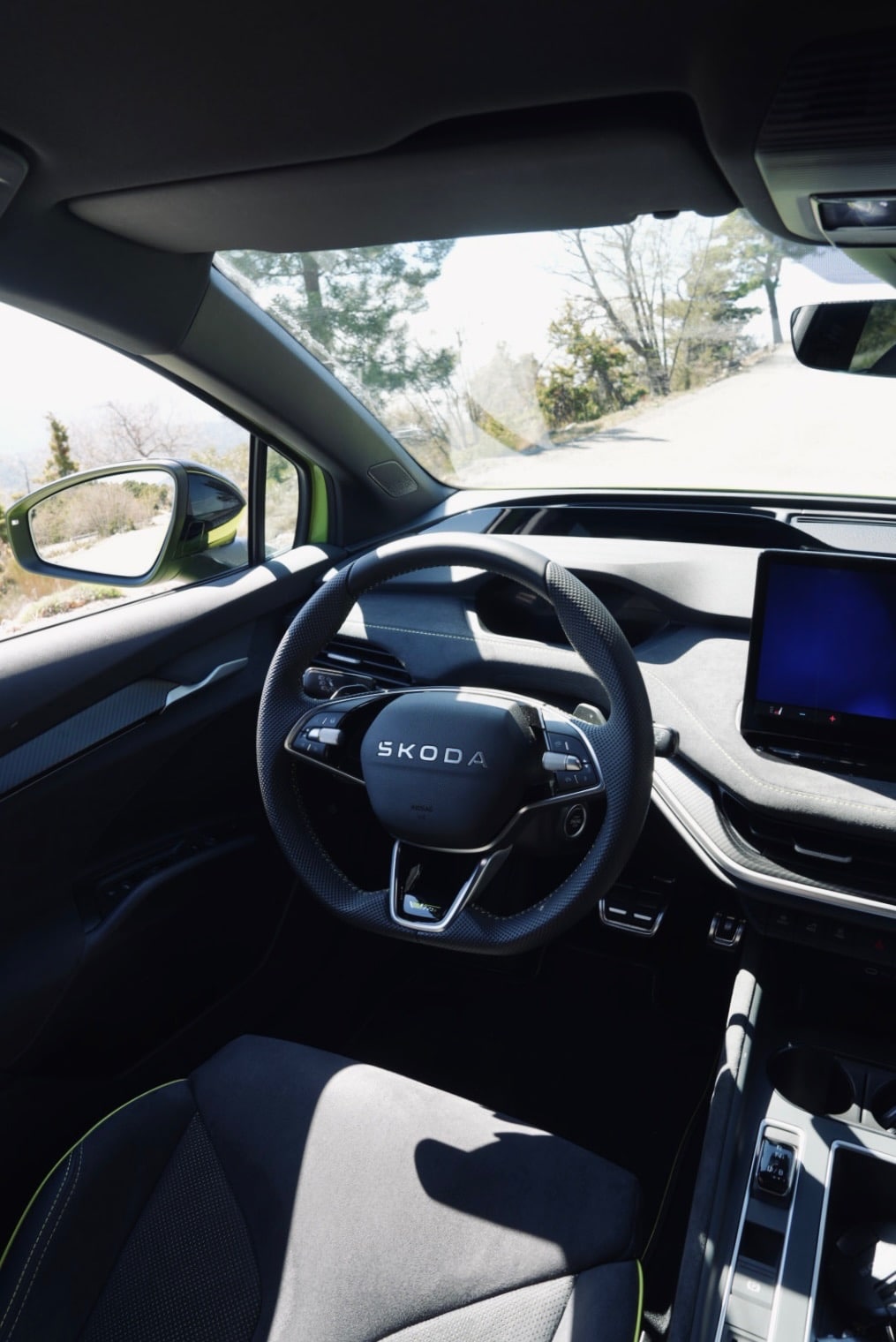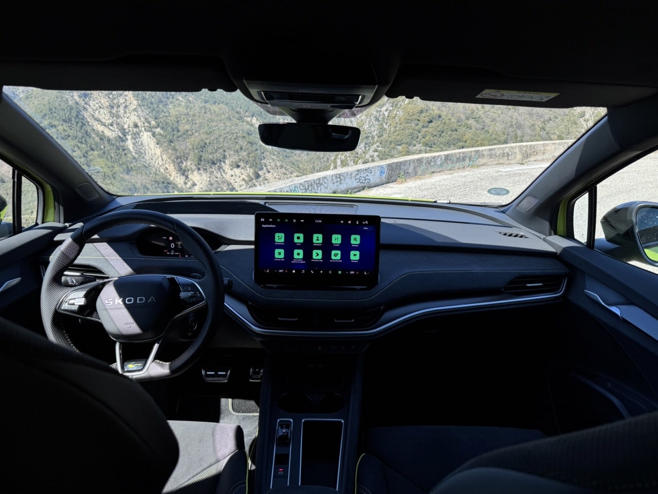 Les matériaux sont soignés, avec des surpiqûres reprenant la teinte extérieure, et des inserts façon carbone ou suédine qui habillent la planche de bord. L’ensemble donne une impression qualitative, renforcée par une finition sérieuse à laquelle Skoda nous à présent habitué. Contrairement à d’autres modèles électriques qui misent sur des interfaces 100 % tactiles, Skoda a choisi de conserver plusieurs commandes physiques, notamment sous les aérateurs. C’est une bonne nouvelle en matière d’ergonomie, il est plus facile de s’y retrouver.