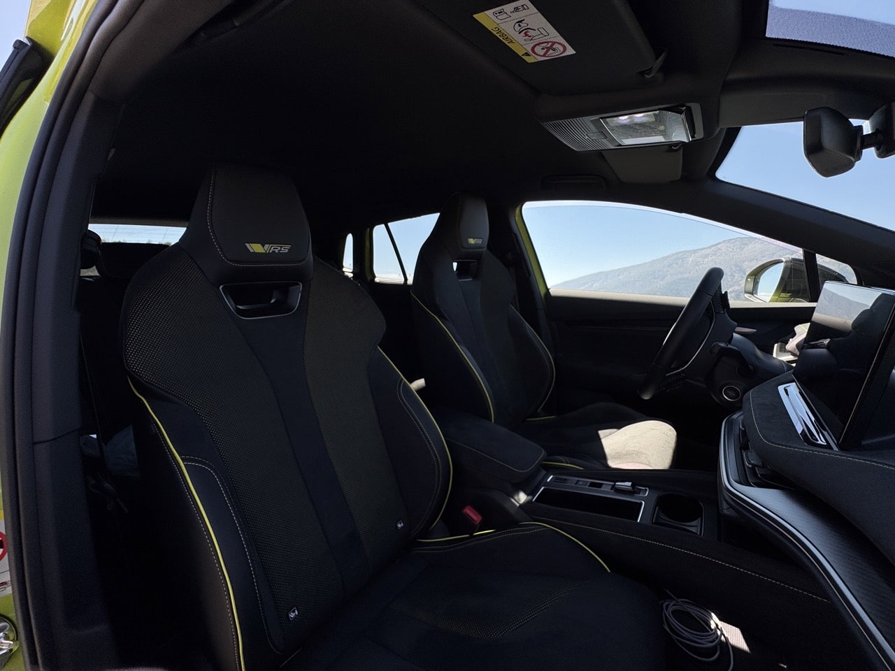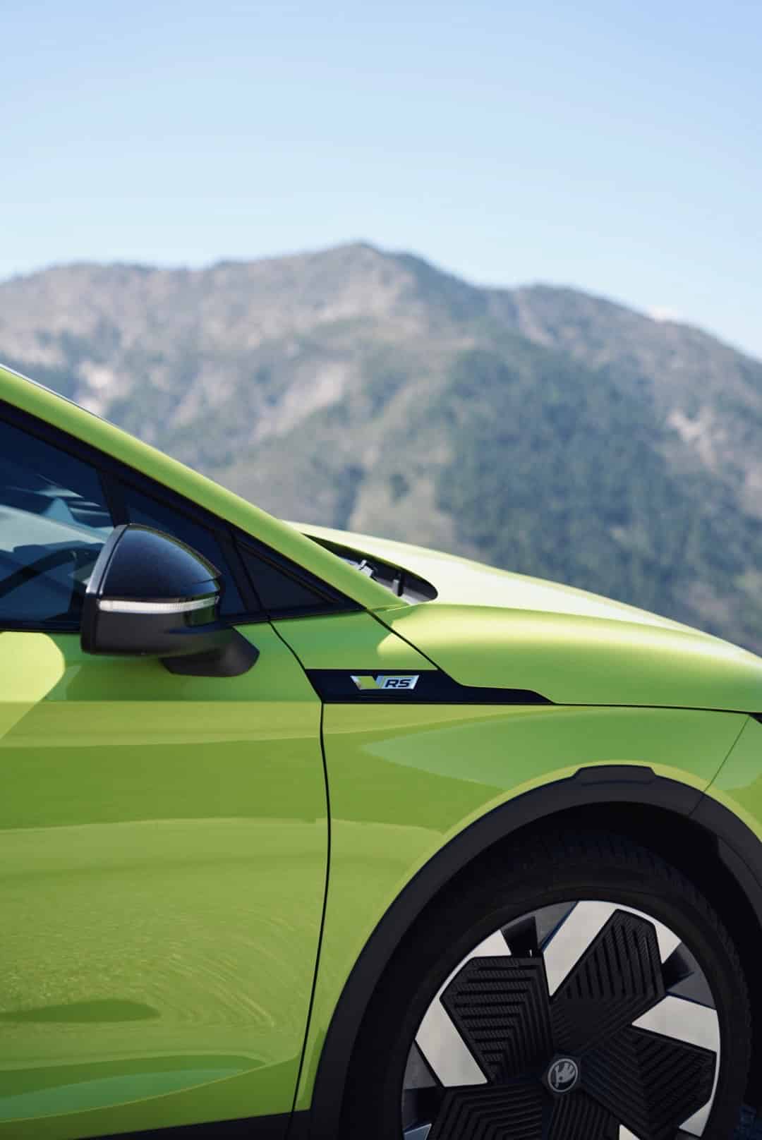 Les designers tchèques ont revu les boucliers avant et arrière, plus sculptés, et intégré des éléments spécifiques pour souligner le dynamisme. Les jantes peuvent atteindre 21 pouces. La teinte exclusive vert Mamba, très voyante, joue à fond la carte sportive, mais elle peut être remplacée par des coloris plus sobres. Mais le Vert Mamba tranche tellement avec l’univers maussade du quotidien qu’autant en profiter pour mettre un peu de couleur dans son train-train, une teinte que nous avions apprécié lors de l’essai de la Skoda Octavia RS. Le badge RS, désormais ancré dans la gamme Skoda (après les Fabia, Kodiaq, Octavia et Enyaq), complète cette présentation plus sportive.