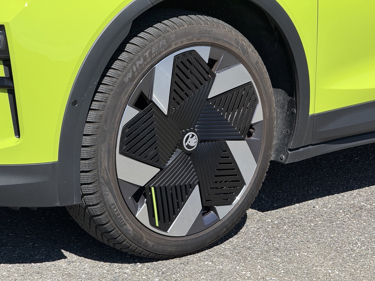 Sous le capot, ou plutôt sous le plancher, cette version RS se démarque par une configuration technique spécifique à cette version (du moins dans la gamme de l’Elroq). La version RS reprend la plateforme MEB du groupe Volkswagen, mais reçoit deux moteurs électriques, un sur chaque essieu, pour une puissance cumulée de 340 chevaux. Le couple est réparti entre l’avant (134 Nm) et l’arrière (545 Nm), permettant de garantir une motricité optimale quelles que soient les conditions, notamment sur neige. Résultat : un 0 à 100 km/h abattu en 5,4 secondes, faisant de l’Elroq RS la Skoda la plus rapide jamais produite.