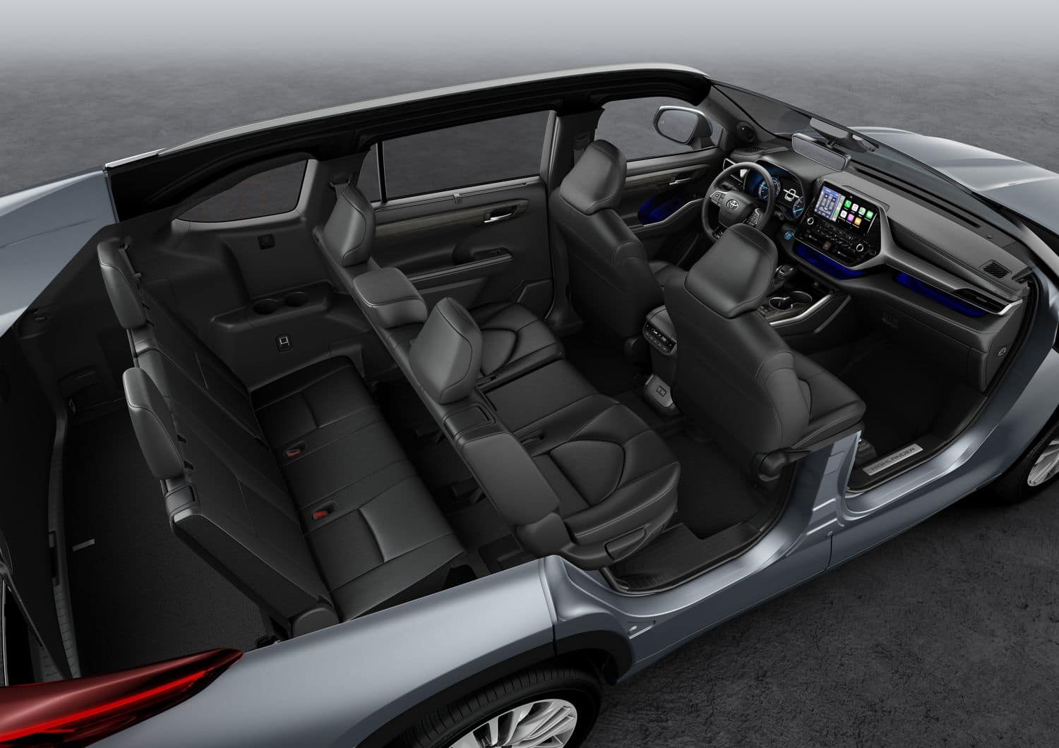 Ce modèle mesure 4,95 mètres de longueur et peut embarquer 7 personnes. Toyota promet une habitabilité généreuse, avec la présence au centre d’une banquette coulissante. Le coffre, avec hayon à ouverture mains libres, est aussi géant : 658 litres. Au niveau de la planche de bord, on trouve un très grand écran tactile de 12,3 pouces. La console centrale est prise dans un cadre qui se prolonge face au passager. Le Highlander adopte un rétroviseur central qui affiche les images filmées par une caméra à l’arrière, ce qui permet d’avoir une vision bien dégagée.