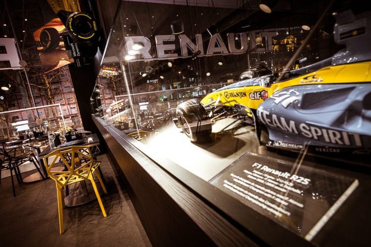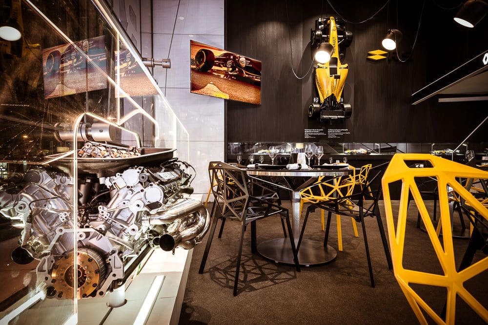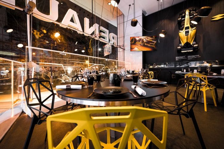 Renault a plus de 100 ans de présence sur les Champs-Elysées. Son « magasin-vitrine » situé au 53 de la plus belle avenue du monde est un lieu d’exposition (avec des nouveautés, des concepts, des véhicules de compétition), une boutique et aussi un bar-restaurant. Et la marque a eu une idée originale pour associer l’automobile et la gastronomie : un « corner food » inspiré du monde la Formule 1, avec décoration et carte assorties.