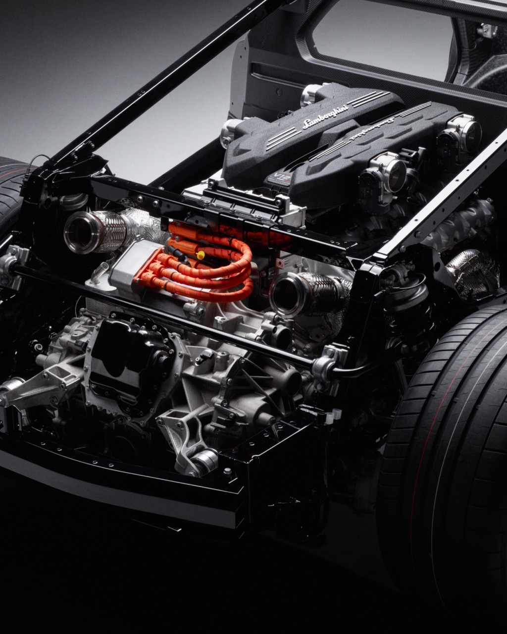 Les moteurs électriques servent les performances, on en compte 3. Un est intégré dans la boîte de vitesses, cette dernière est pour la première fois derrière le moteur. On retrouve les deux autres moteurs sur le train avant alimentant chacun une roue, chacun développe 350 Nm de couple tandis que celui entre le moteur et la boîte apporte 150 Nm de couple. De ce fait, Lamborghini annonce une puissance cumulée de 1015 chevaux.