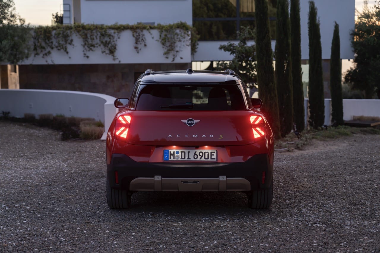 La calandre avant est plus proche de la Cooper avec des rondeurs, mais les ailes avant et les passages de roues ont des formes plus anguleuses. À l’arrière, le Aceman a des optiques à LED avec différentes signatures lumineuses. Ces derniers peuvent bien sûr afficher l’Union Jack, une particularité qu’avait introduite la Mini Cooper F56.