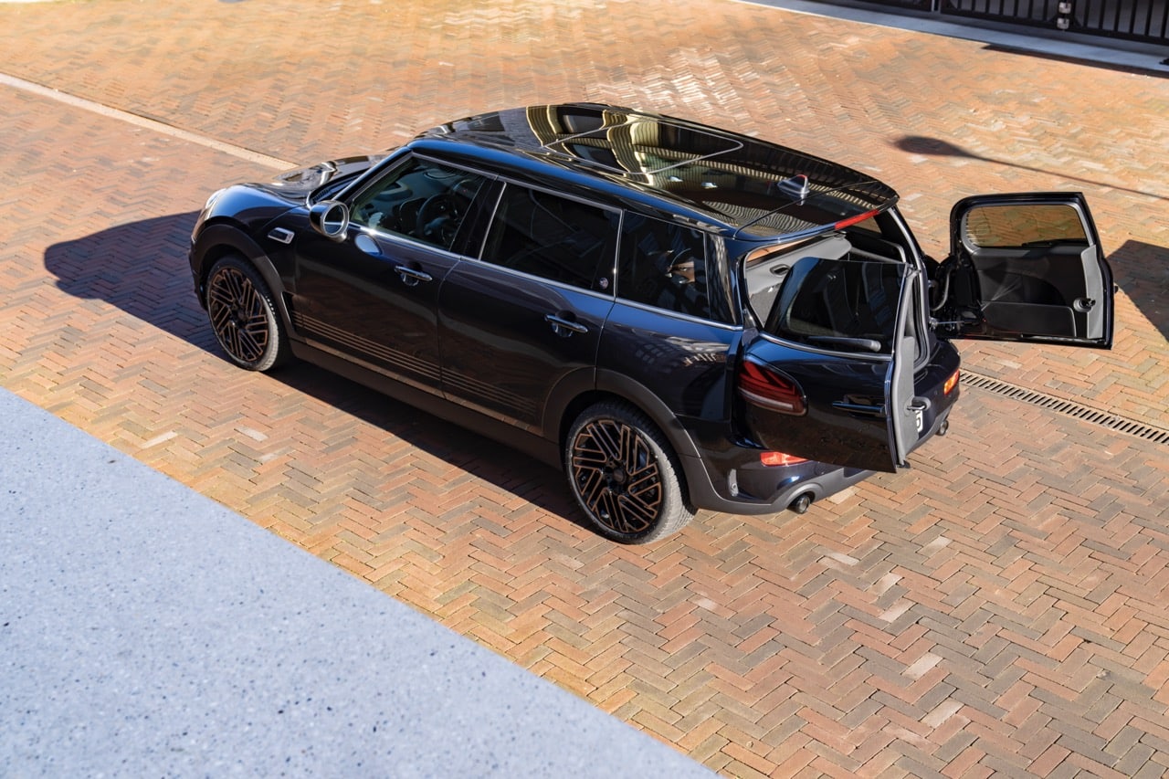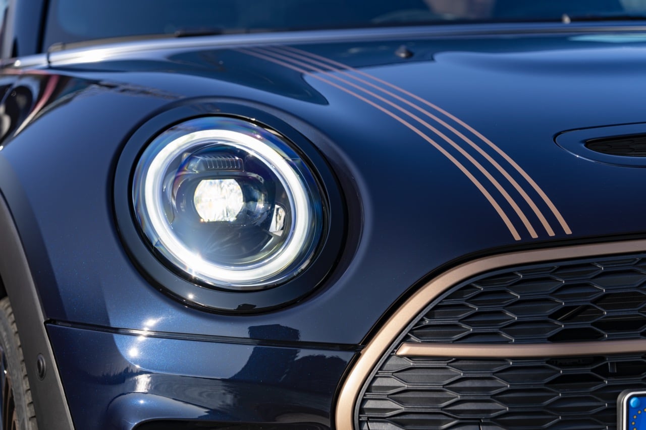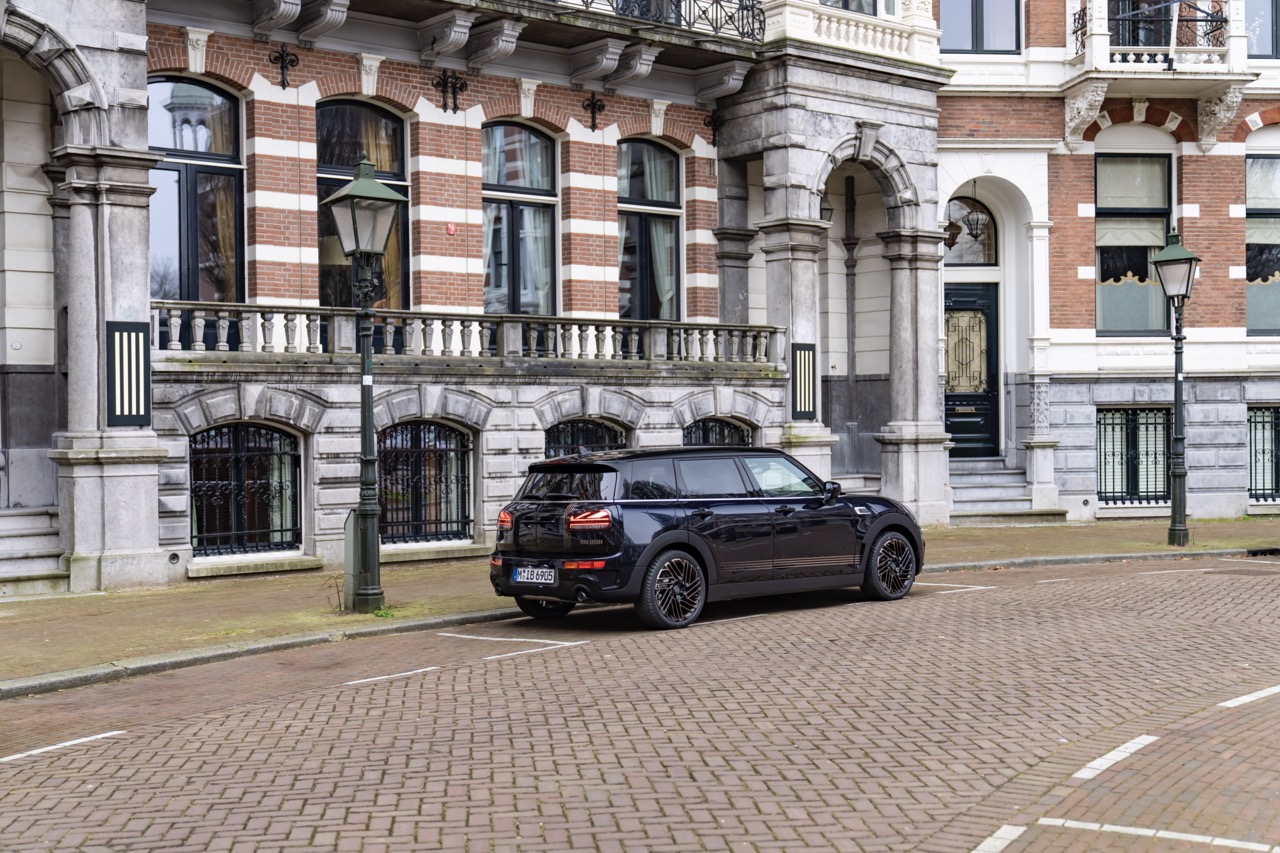 Le profil allongé du Clubman est souligné par 4 lignes cuivrées qui courent sur le profil du Clubman, on le retrouve aussi sur le capot et la porte arrière droite. On retrouve aussi le badge « Final Edition » sur l’arrière, la mention « 1 of 1969 » au niveau des montants C et enfin « Final Edition 1969 » proche des ouïes latérales.