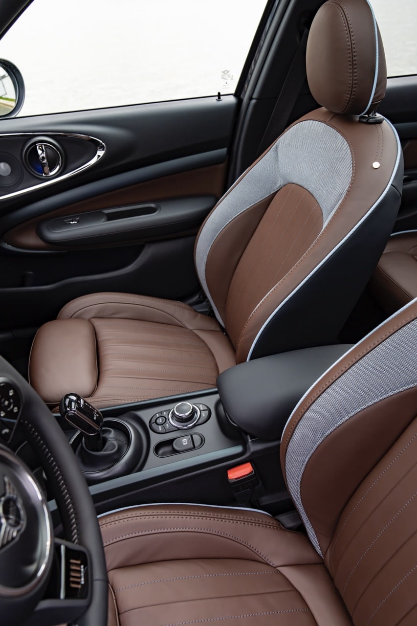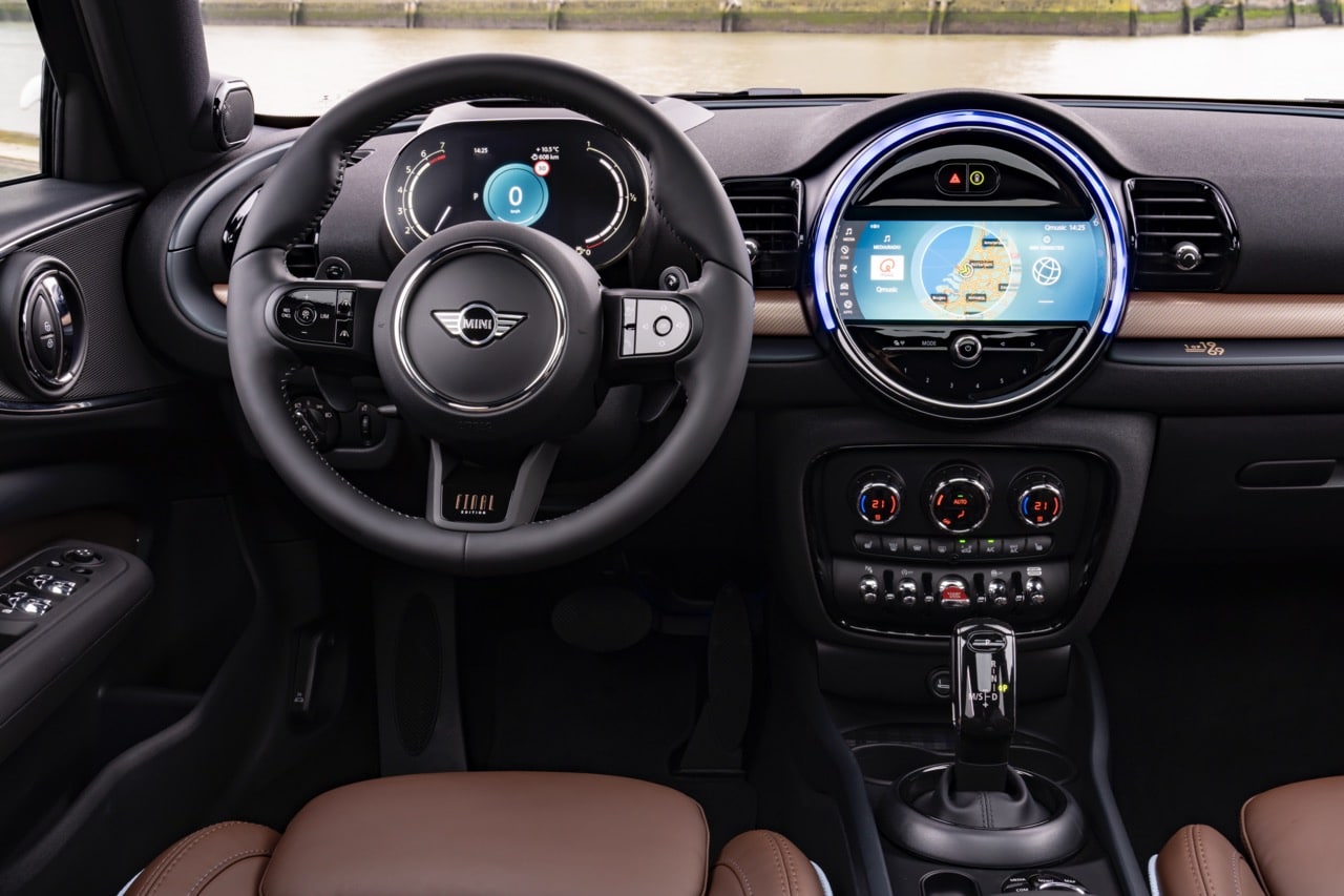 Pour célébrer dignement la fin de génération de la Mini Clubman, cette Final Edition se dote de seuils de portes spécifiques, l’appellation de la série spéciale sur la branche inférieure du volant, ce dernier est un volant sport gainé cuir Nappa. On y retrouve des sièges avant sport habillés d’une sellerie cuir Lounge MINI Yours Dark Maroon et d’un insert en tissu Piquet anthracite, d’empiècements « Final Edition » et des passepoils de couleur bleu ciel contrastants.