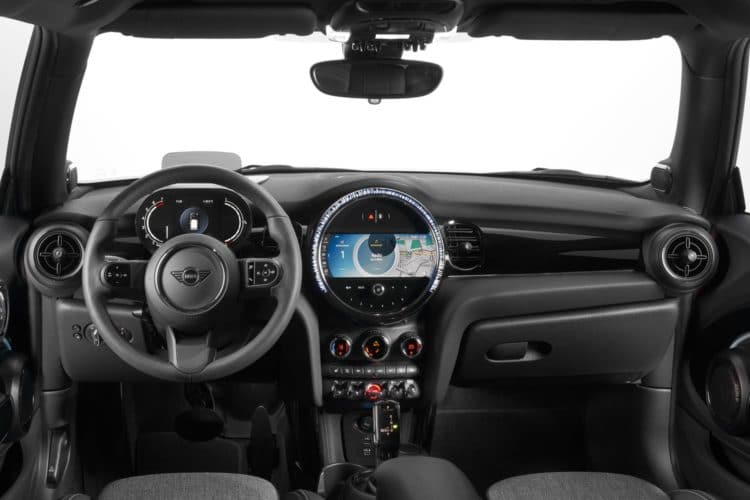 A l’intérieur, ça change par petites touches. Il y a un nouveau volant, aux touches promises plus ergonomiques. L’instrumentation numérique 5 pouces, vue sur la variante électrique, est généralisée. Le dessin des aérateurs centraux est revu, ils sont maintenant mieux intégré au bandeau décoratif. Dès la version de base, on a un écran tactile 8,8 pouces. La Mini peut recevoir un nouvel éclairage d’ambiance.