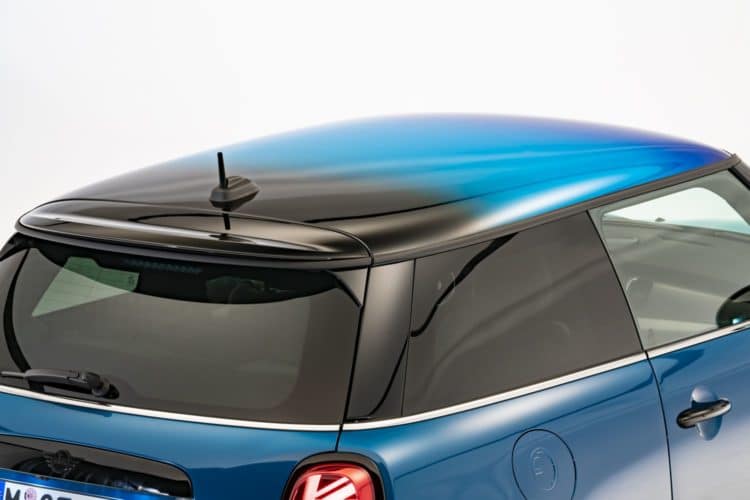 Le visage est inédit, avec un style que Mini décrit comme plus épuré. Certes, les projecteurs additionnels ont été gommés, et remplacés par de fines ouvertures sur les côtés du bouclier. Mais épuré n’est pas le mot qui nous vient à l’esprit quand on voit l’épais contour noir qui entoure les prises d’air. Cette Mini semble avoir une bouche béante et grimaçante ! Le bouclier arrière adopte un décor qui évoque cet élément noir. On retrouve la sympathique signature lumineuse en forme de drapeau anglais. Côté personnalisation, outre de nouvelles couleurs et des dessins de jantes inédits, on retient l’option toit « multitone ». Le pavillon adopte un surprenant dégradé, du bleu au noir.