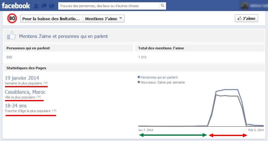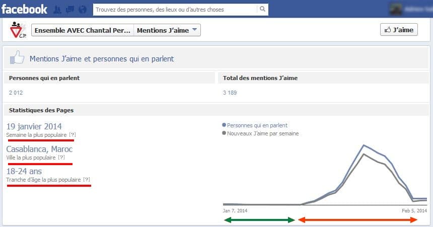 Quand on regarde un peu plus en détail les statistiques de la page, on remarque qu’entre le début et la fin du mois de janvier 2014, les mentions « j’aime » ont augmenté de 900 % ! La semaine la plus populaire étant le 19 janvier – aucun événement particulier ne correspond à cette date – et surtout deux autres indicateurs laissent penser qu’il s’agit ici d’une fraude et/ou d’un achat de fans. La majorité des suiveurs habitent Casablanca et sont âgés de 18 à 24 ans ! Deux éléments incompatibles avec la LCVR qui officie en France et on serait bien étonné d’apprendre que ces jeunes marocains s’intéressent à Chantal Perrichon…
