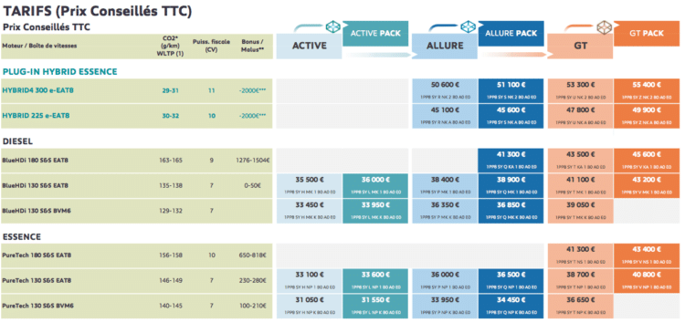 En ce qui concerne le plug-in, on a un 225 ch en traction et un 300 ch quatre roues motrices (un deuxième bloc électrique entraîne les roues arrière). Côté thermique, on a des essences de 130 et 180 ch, et des diesels de 130 et 180 ch. A chaque fois, le 180 ch a en série la boîte automatique 8 rapports. Celle-ci est en option sur le 130 ch.