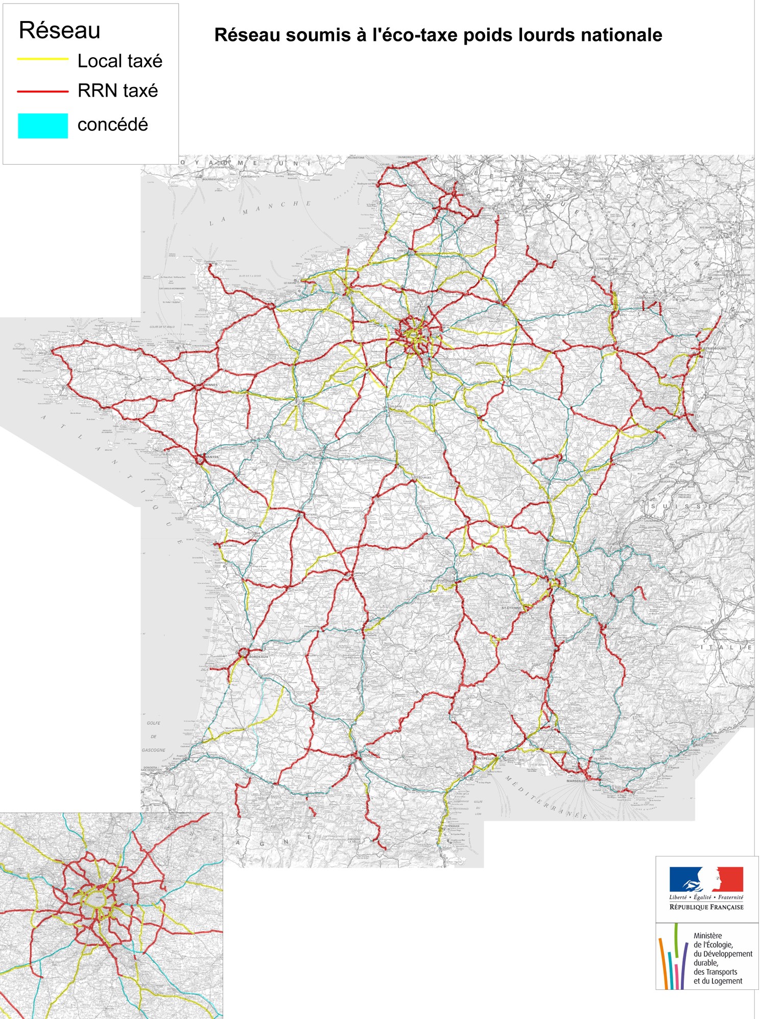 10 000 km de réseau national et 5 000 km de réseau local seront concernés par ce dispositif. 173 portiques et environ 130 bornes mobiles déplaçables sur 500 emplacements qui seront installées sur tout le réseau pour contrôler les quelques 600 000 PL français et les 200 000 PL étrangers (voir la carte du réseau taxé).