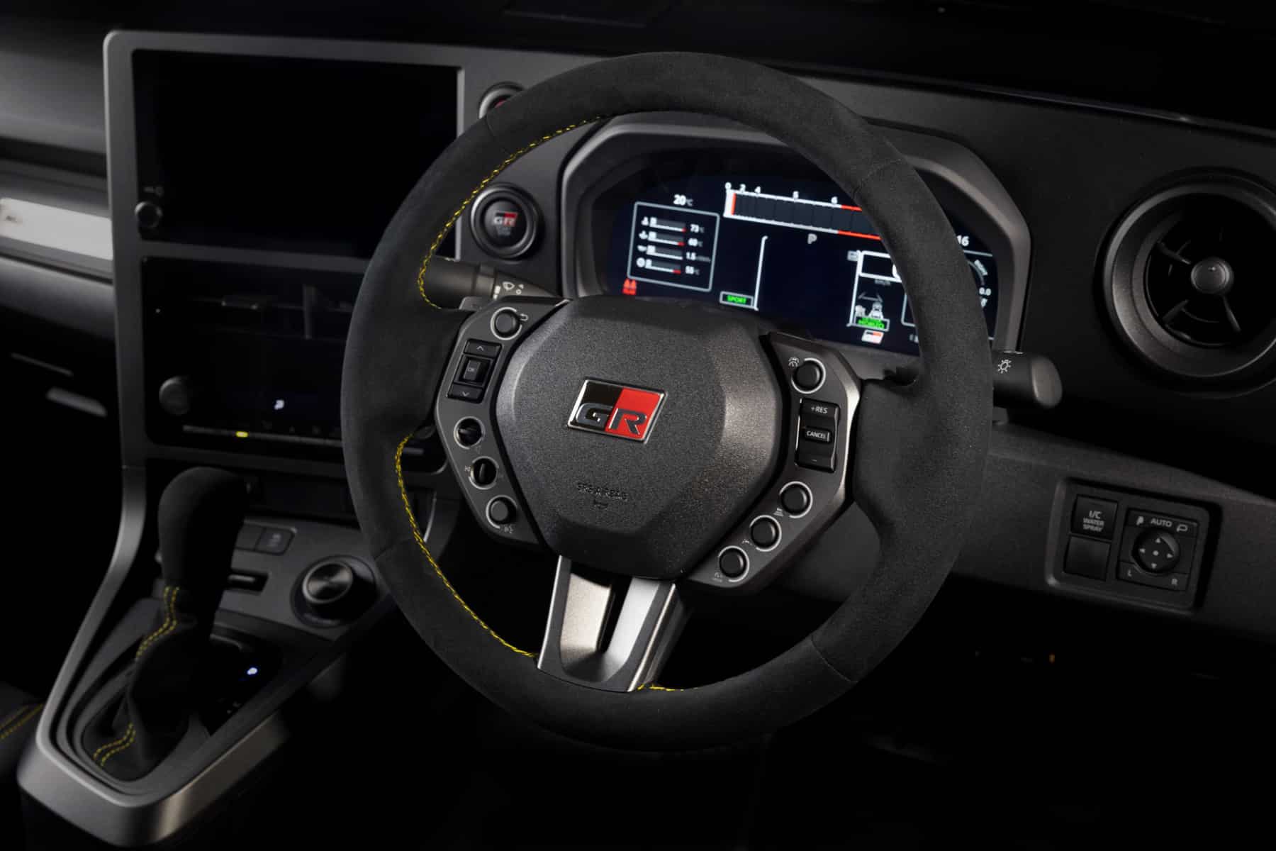 Mais ce n’est pas tout : un nouveau mode de répartition de la puissance est ajouté. Le mode Morizo remplace le Gravel et propose une répartition 50:50 afin de maximiser l’adhérence. Dans l’habitacle, la pièce la plus reconnaissable est le volant en suédine. Son diamètre est plus petit et il intègre des palettes ainsi que des commandes améliorées, dont l’inspiration provient directement du volant des GR Yaris Rally2 engagées en Championnat du monde des rallyes.