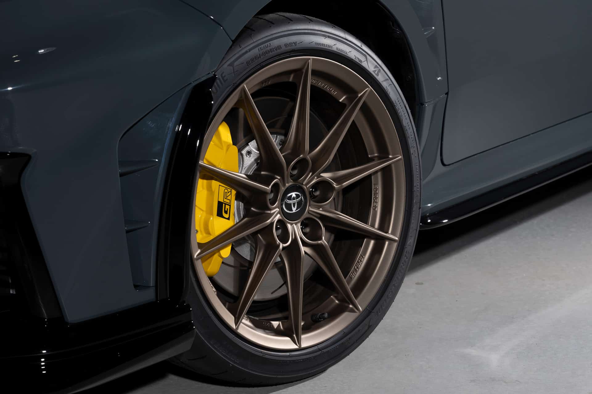 L’extérieur n’est pas en reste, puisque cette GR Yaris est la plus agressive des GR Yaris produites, à l’exception peut-être de la GRMN. On retrouve une teinte spécifique à la Morizo RR, une calandre Piano Black, ainsi que des jantes BBS en aluminium forgé dotées d’une nouvelle finition Bronze Mat, associées à des étriers de frein jaunes. Mais le plus impressionnant reste la lame de bouclier avant, les jupes latérales spécifiques, l’aileron arrière ainsi qu’un capot en fibre de carbone.