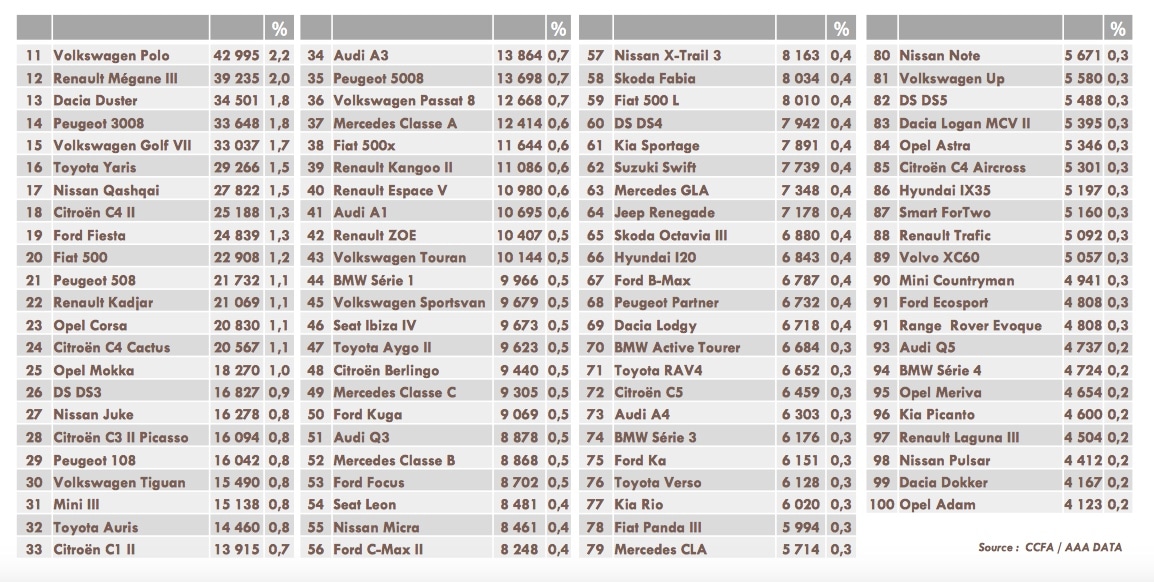 La deuxième génération de la 308 confirme son succès. Lancée fin 2013, elle termine sa deuxième année pleine avec une sacrée hausse des ventes, passant de 60.842 exemplaires à 75.474. Cette envolée lui permet de doubler le Renault Captur et de prendre place sur le podium, derrière les Clio et 208. A voir si la lionne va se maintenir ou pas avec l’arrivée de la Mégane 4 dès janvier !