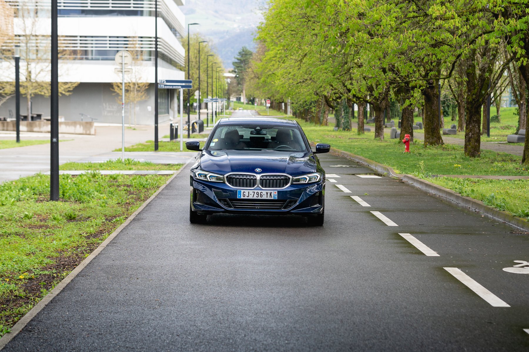 Pas de chichi, pas de motorisation flamboyante ni de finition supérieure : notre BMW Série 3 restylée de prêt ne verse pas dans l’extravagant. Et c’est tant mieux ! Si l’on croise très souvent des finitions M Sport sur les BMW récentes, celle que vous avez sous les yeux en est dépourvue. Le look perd un tout petit peu en agressivité, ce qui n’est pas désagréable pour une auto du quotidien qui n’a aucune velléité sportive. Drapez là du joli bleu sombre métallisé Tansanitblau et vous obtenez une auto absolument passe-partout, malgré les jantes de 18 pouces optionnelles.