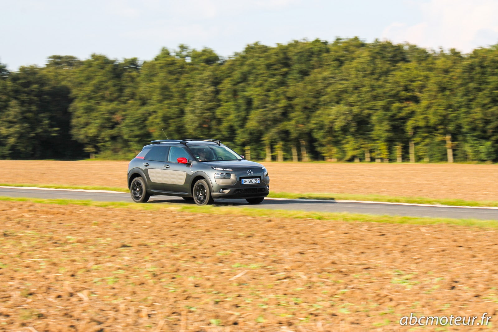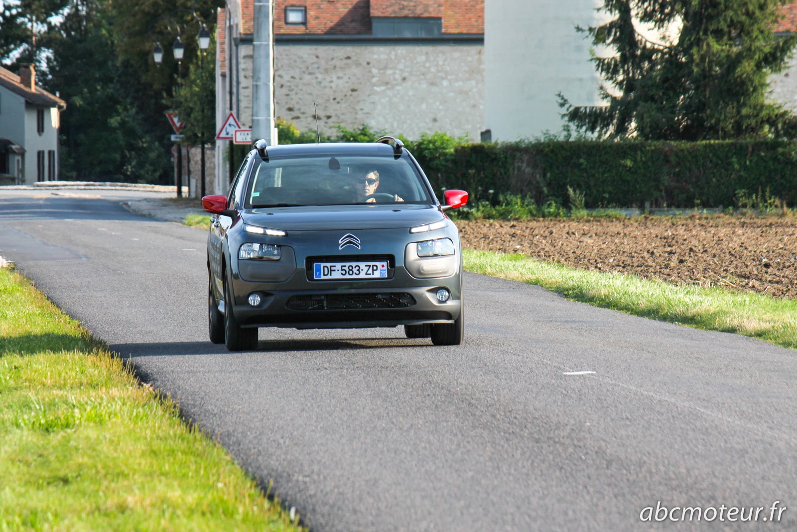 Sur petite route, le C4 Cactus freinera assez vite vos envies de pilotage… Bien que le comportement soit très sain et efficace et que la recherche aboutie de légèreté (1 120 kg) se retrouve à la conduite, cette voiture un brin surélevée trahit une légère prise de roulis bien moindre qu’un Picasso de première génération , tandis que la direction, bien qu’assez informative, n’est pas tout à fait assez ferme dans ces conditions.
