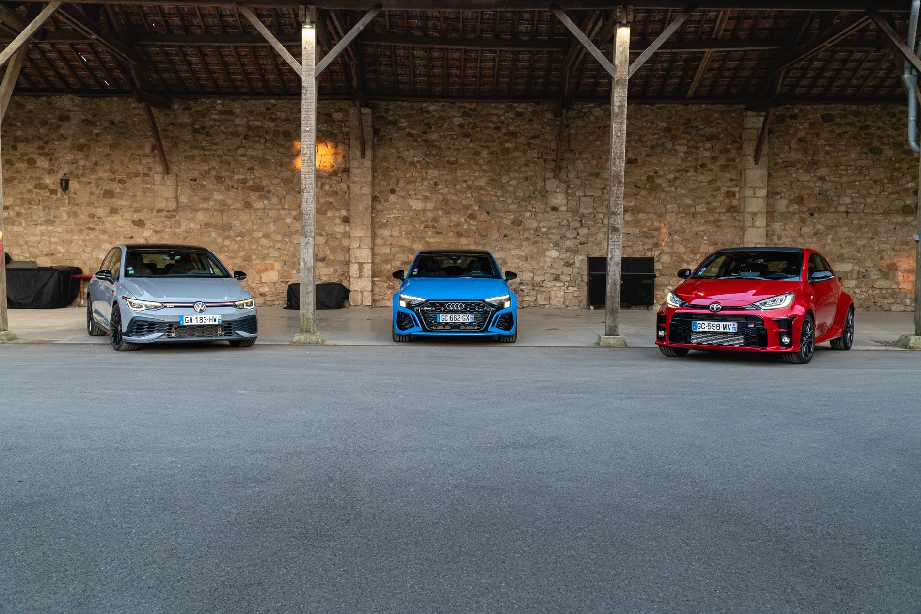 PNC aux portes, armement des toboggans… Si vous avez déjà voyagé avec Air France, vous connaissez la suite de cette célèbre tirade énoncée inlassablement avant chaque décollage. Aussi je vous l’épargne, mais ne saurais que trop vous conseiller d’attacher votre ceinture pour notre trio du jour. Et si je n’ai pas de casquette de commandant de bord, j’en endosse la responsabilité pour vous permettre d’arriver à bon (aéro)port. Ce n’est pas un hasard si j’ai baptisé notre vol fictif « 345 », et les plus fins observateurs auront remarqué que le chiffre correspond au nombre de cylindres de nos trois furies : 3 pour la Toyota GR Yaris Track, 4 pour la Volkswagen Golf GTI Clubsport et 5 pour l’Audi RS 3 quattro. Le dénominateur commun ? Toutes émanent de constructeurs dont la communication est massivement tournée vers l’électrification, peu importe sa forme, véritable cheval de bataille des décideurs politiques. Un changement louable et jugé nécessaire pour aider à ce que notre chère planète bleue ne s’asphyxie pas, mais qui est malheureusement souvent aux antipodes du plaisir de conduire et de la passion automobile. Aussi, le temps d’une rapide mais ô combien délicieuse pause de quelques jours, avons-nous décidé de nous octroyer la joie rétrograde de réunir trois des modèles les plus excitants desdits constructeurs. Ladies, Gentlemen, start your engines !