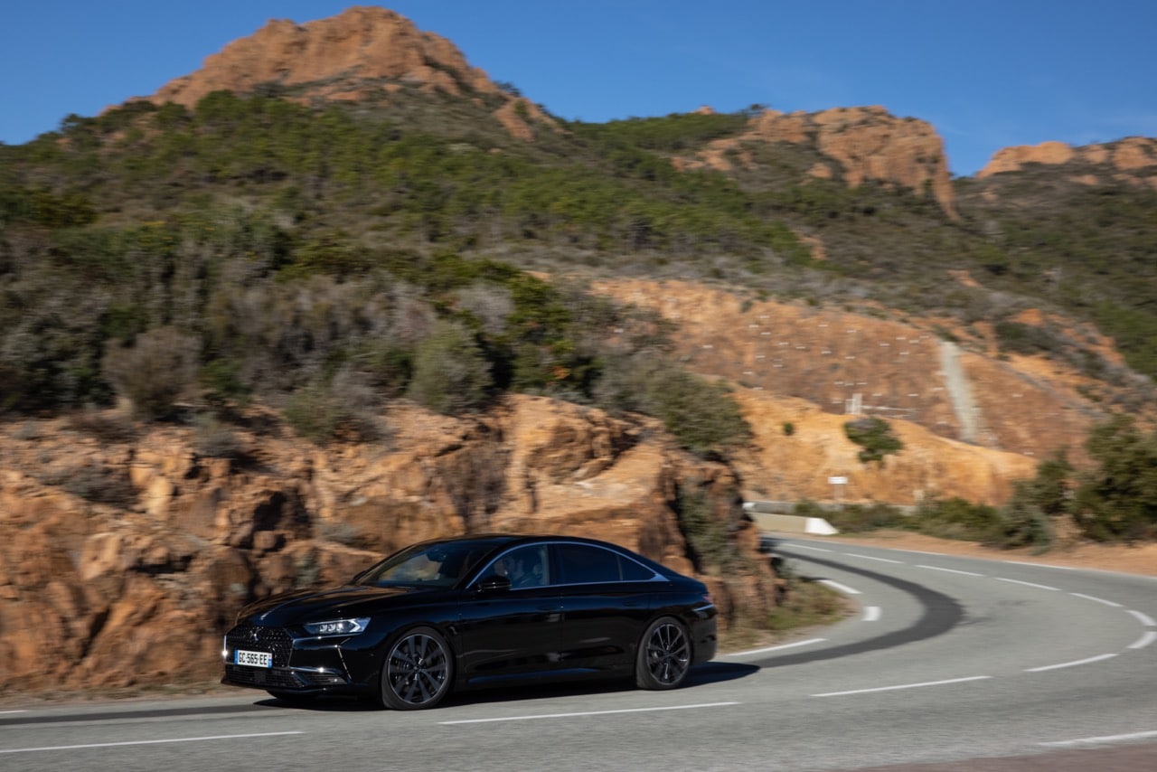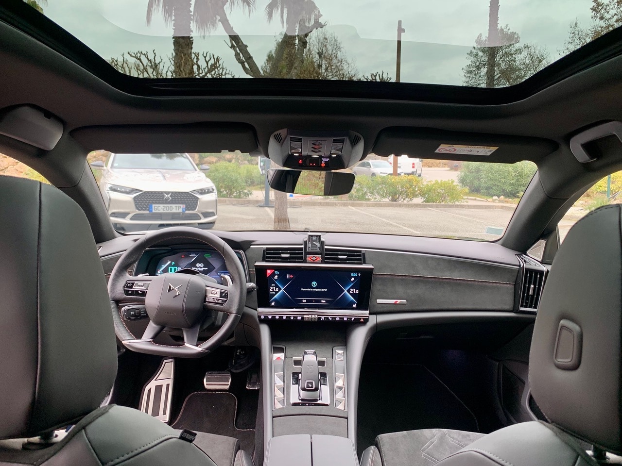 Au volant cela se traduit par une DS 9 aux deux visages. En bonne berline, elle sait se faire confortable, en mode confort la suspension est douce mais elle aurait pu l’être encore plus. La transition entre tout électrique et hybride ne se fait pas sentir, tout comme le passage des rapports. Cette DS 9 invite à rouler, profiter du paysage à une allure de balade. C’est exactement de cette manière qu’on profite d’abord de la DS 9 sur les routes de la Côte-d’Azur. On ouvre le toit ouvrant, un air de jazz, lunette de soleil et on se détend.