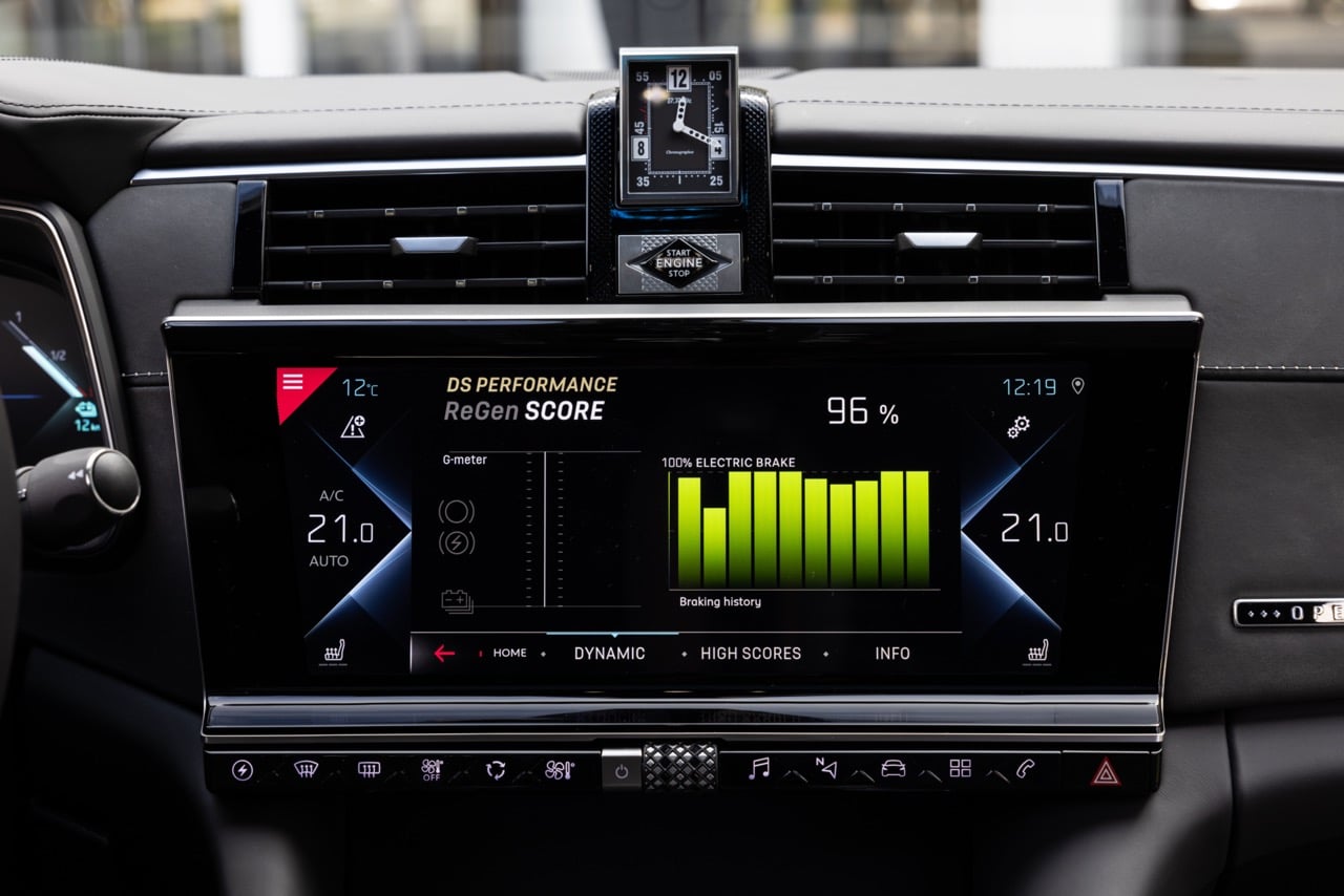 Cette E-TENSE 4×4 360 embarque une application spécifique, l’Energy Coach développée en partenariat avec Jean-Éric Vergne le pilote de l’écurie de Formula E de DS. Cette fonction donne un score à vos freinages en favorisant la récupération d’énergie. Un moyen d’inciter à adopter un style de conduite plus productif en électricité en s’appuyant sur une décélération régénératrice. On se prend au jeu a anticiper ses freinages et user du mode B de la boîte de vitesses qui est la récupération d’énergie.