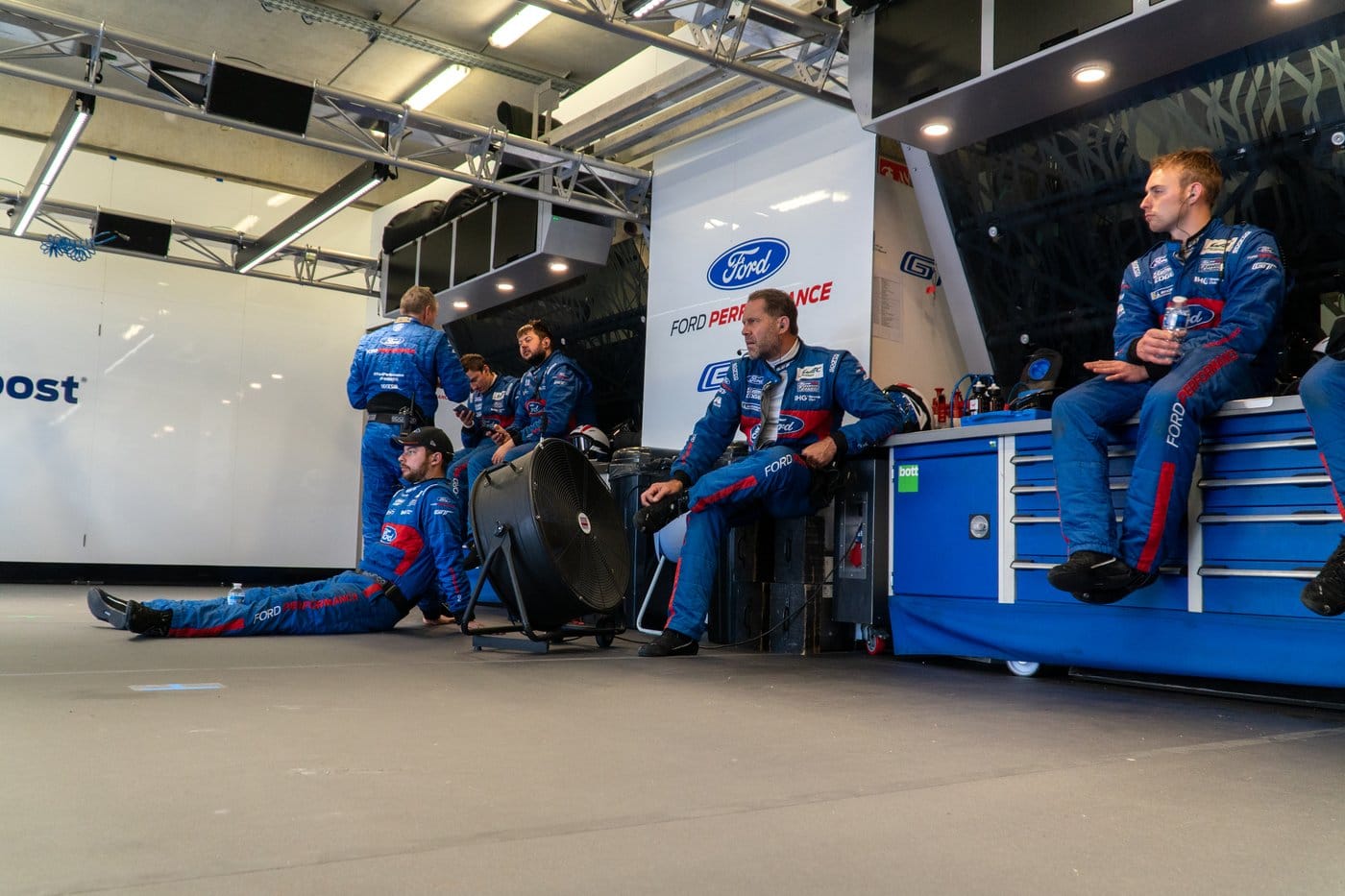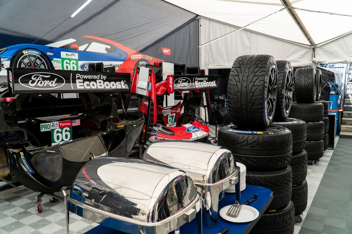 Pour cette journée test, l’ambiance était encore détendue dans les stands. Les sourires sont nombreux, quelques blagues s’échangent, la pression n’est pas encore là. Mais bien vite, dès qu’un des pilotes annonce qu’il va rentrer au stand, les hommes s’animent. Dans un ballet coordonné, chacun fonce à son poste, se prépare à sa tache, répétée des milliers de fois, pour viser l’efficacité maximum. Pas d’hésitation, pas de cafouillage, le stand est d’un coup devenu une scène remplis d’acteurs de talents. Les changements de pneus sont faits, le réservoir rempli et les réglages effectués. La GT repart dans un vacarme tonitruant (tout le monde sans exception porte des casques anti-bruit) et le calme retombe dans le box. Derrière, un petit bureau bien gardé rempli d’écran montre toute la télémétrie en temps réel. Enfin, la plus partie la plus éloignée de la piste concentre les nombreuses pièces de rechange et les motorhomes des pilotes. Tout le team Ford Chip Ganassi Racing espère réitérer les exploits de 1966 et 2016, et repartir avec une dernière victoire pour un départ en fanfare du championnat. Réponse le 16 juin, à 15h.
