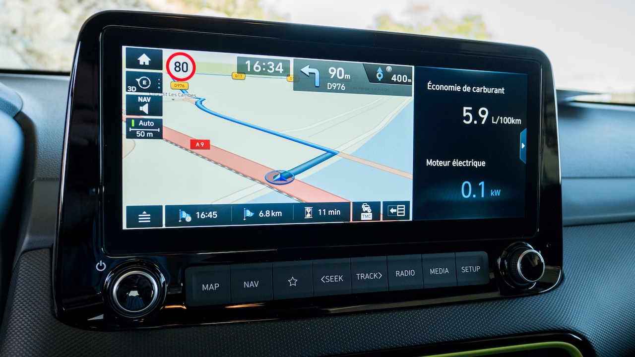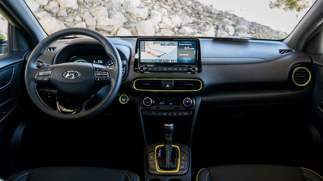 Le Kona Hybrid, présenté il y a peu de temps et commercialisé cet automne, se différencie très peu de la version thermique côté style. Il garde ses attributs de SUV (protections de carrosserie grises, sabot façon aluminium,…) et son design atypique avec le regard à deux étages, mais se dote en plus de jantes spécifiques et de logos sur le hayon et les ailes à l’avant. A l’intérieur, même topo : on retrouve l’habitacle du Kona thermique, qui accueille d’ailleurs quelques touches de couleur (vert anis, rouge, blanc ou orange). Il est également agrémenté de quelques nouveautés comme l’écran tactile qui grandit et passe de 8 à 10,25 pouces. Celui-ci intègre d’ailleurs le nouvel ensemble de services connectés BlueLink. Ce système relie la voiture et le smartphone de son propriétaire pour permettre de retrouver certaines informations à distance depuis son téléphone, comme l’autonomie, la localisation ou encore le contrôle de la climatisation par exemple. Ces services seront ensuite déployés sur le reste de la gamme. Le Kona hybride est comme le reste de la gamme doté des dernières aides à la conduite (parfois envahissantes) mais aussi d’un système inédit, qui conseille de lever le pied pour profiter du frein régénératif dans une descente par exemple. Le système fonctionne avec la navigation, et un petit pictogramme s’affiche simplement sur l’ordinateur de bord avec un son en rappel.