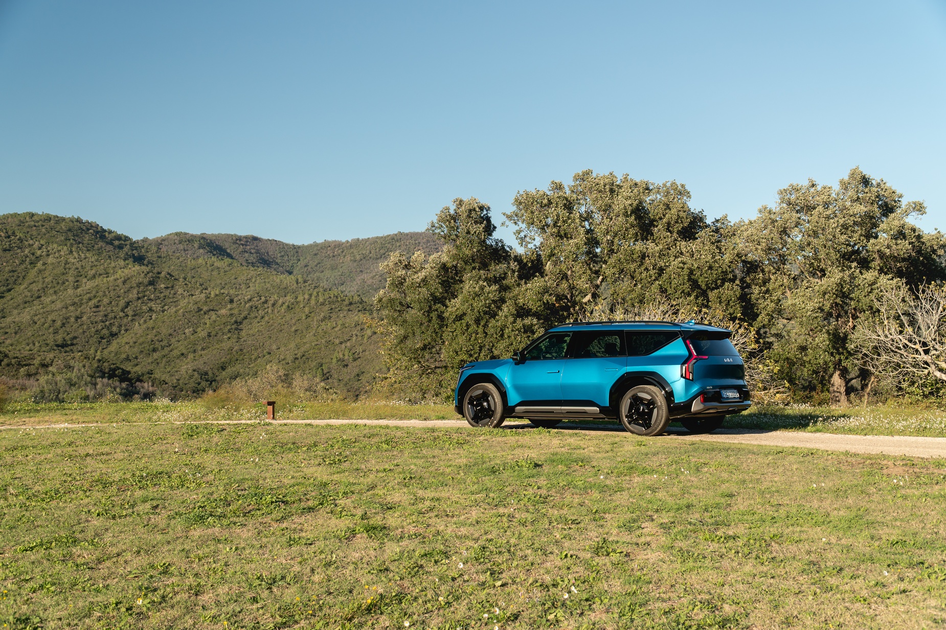 Le grand volant et la direction très démultipliée n’incitent de toute manière pas à rouler couteau entre les dents, mais les enchaînements de virages ne font pas peur à l’EV9 qui parvient à masquer ses 2 569 kg à vide assez habilement tant qu’on ne le brusque pas. Il faut dire qu’avec des jantes de 21 pouces et des pneus en 285 de large aux quatre coins, la surface au sol est conséquente… C’est sur le mouillé qu’il faudra se méfier de cette immense masse en mouvement, qui peut alors se montrer piégeuse. Sur le sec en tout cas, l’ESP intervient finement et rapidement pour éviter toute glissade.