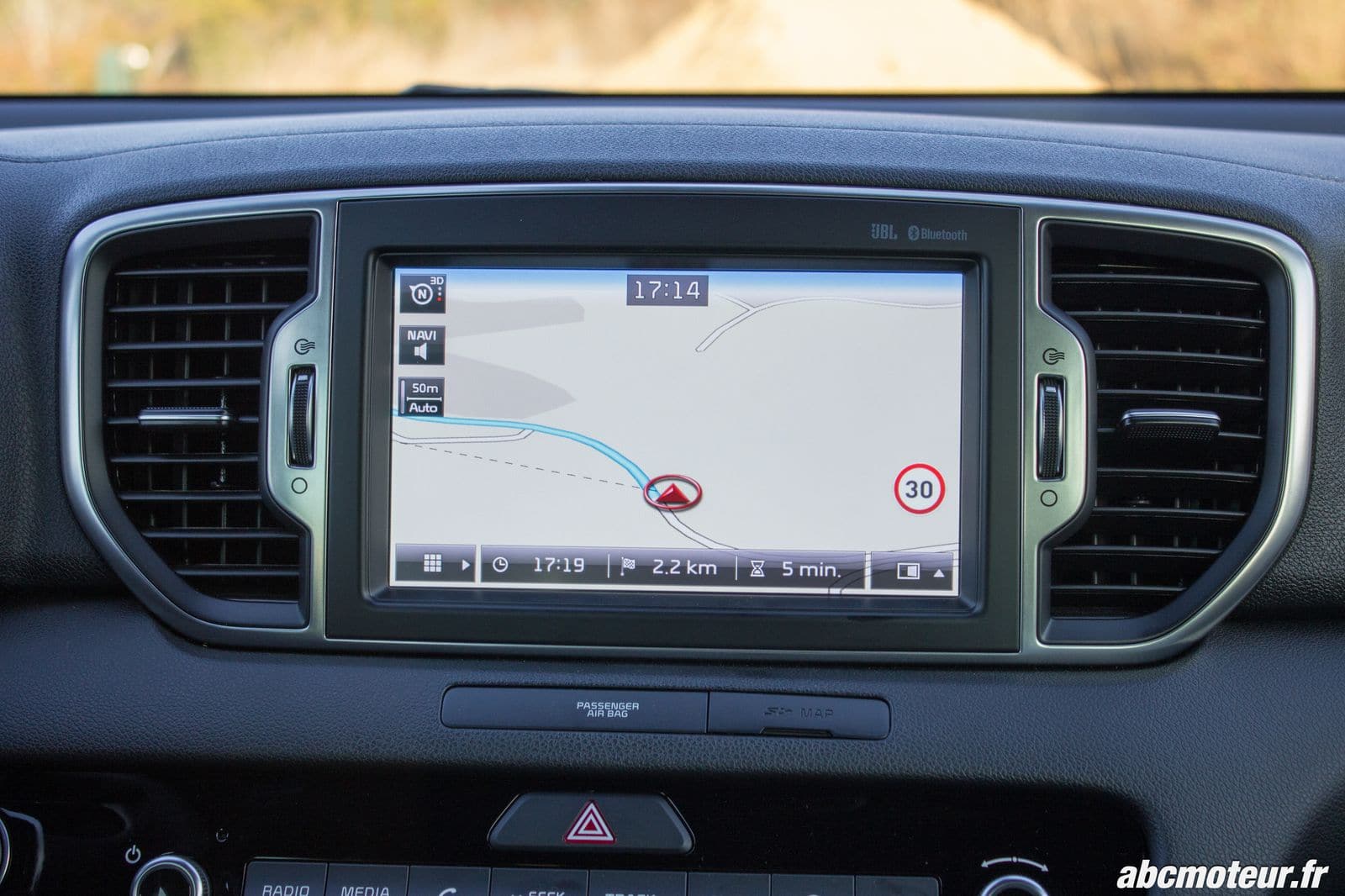 L’intérieur est agréable, propose nombre de rangements et respire le sérieux. Les ajustements sont bons et seuls quelques plastiques durs en partie basse de l’habitacle sont peu flatteurs au toucher. En dehors de ça, on s’y sent rapidement chez soi. La longueur totale du Sportage a augmenté de 40 mm, ce qui a permis aux ingénieurs d’accroître l’empattement de 30 mm au bénéfice direct de l’habitabilité. Le coffre en profite pour offrir 26 L de plus en passant à 491 L (1 492 L sièges rabattus).