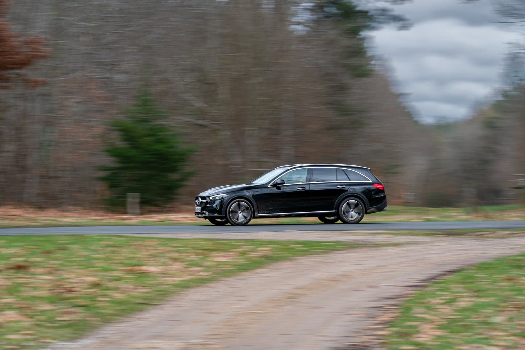 En dehors de la taille, le plus gros des différences entre une Classe C All-Terrain et une E All-Terrain se fait au niveau du châssis. Celui de la C, plus basique, ne peut être équipé d’une suspension pneumatique ni de roues arrière directrices. Le confort de roulement s’en ressent, avec quelques trépidations, quelques remontées un peu sèches dans l’habitacle sur les mouvements rapides et une certaine fermeté à basse vitesse. Mais n’allez pas croire cette suspension passive décevante, elle qui arrive au contraire à proposer un compromis assez pertinent entre confort acceptable et qualités dynamiques intéressantes.