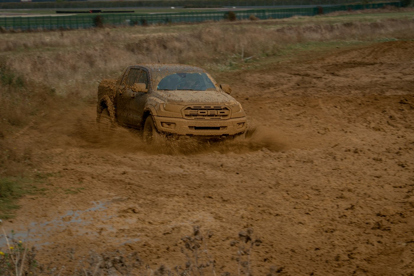 Une fois revenu à une assiette correcte et remis de mes émotions, l’instructeur me guide jusqu’à la piste roulante, complètement détrempée et boueuse à souhait. Il est temps de switcher du mode de conduite Neige/Gravier/Herbe au mode Baja, spécialement conçu pour filer à grande vitesse en hors-piste (six modes au total, qui jouent sur l’intervention de l’ESP, la direction, la dureté des la suspension…). Si mon premier tour de piste est timide, je lâche la bride pour le second sur les conseils de mon instructeur et exploite un peu plus l’incroyable suspension du Ranger Raptor. Les amortisseurs Fox Racing encaissent sans broncher les 80 km/h, petits sauts et grands travers dans les virages relevés, tandis que l’ESP autorise de généreuses dérives relativement simples à contrôler grâce aux quatre roues motrices. Quel engin ! Un constat encore accentué quand l’instructeur prend ensuite le volant pour un tour à bloc. Le pick-up n’a beau être motorisé « que » par un 2.0 diesel de 213 ch et 500 Nm de couple, il est extrêmement capable et peut se montrer franchement rapide. De l’aveu d’un des instructeurs présents ce jour là, il ne manquerait guère qu’un arceau et un extincteur pour engager le Ranger Raptor en rallye-raid.