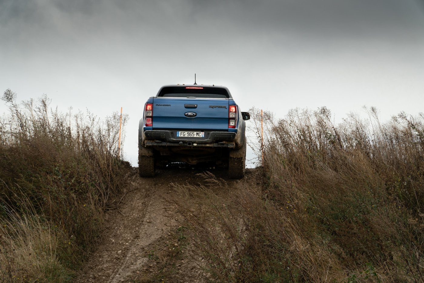 Moi qui n’ai jamais fait de franchissement digne de ce nom, me voilà en train de grimper des côtes dont le degré me ferait chanceler s’il s’agissait d’alcool, de faire des croisements de ponts qui s’apparentent à des montagnes et de passer des ornières où je pourrai rentrer jusqu’à la taille. Et tout ça, dans une décontraction proprement sidérante tant le Ranger Raptor semble avaler le terrain sans se soucier le moins du monde de ce que je peux lui présenter. Rien ne l’arrête ! Avec des angles d’attaque et de fuite de 32,5 et 24 ° respectivement, la plupart des obstacles n’en sont pas vraiment. De même, la garde au sol de 28,3 cm (+ 5,1 cm qu’un Ranger classique) autorise bien des escapades en dehors du bitume.