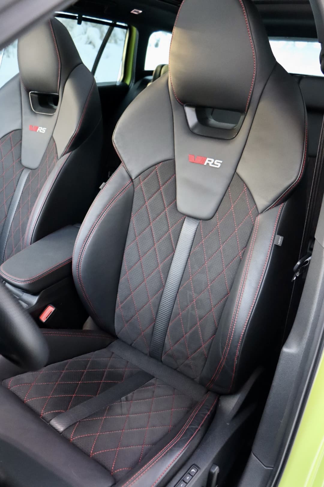 À bord de ces Skoda Octavia Combi, on trouve deux ambiances différentes. Tout d’abord une ambiance sportive avec l’Octavia RS qui se dote de sièges enveloppants à la sellerie spécifique. On y trouve du cuir et du suède noir contrastants avec les surpiqûres rouges et le logo VRS sur le dossier des sièges une option comprise dans le Pack Electrique RS avec sellerie ergonomique à 2 300€. La planche de bord obtient aussi du suède et des inserts en imitation carbone. Le volant sport est en cuir perforé et à un méplat. La prise en main de ce dernier est très bonne, ce qui contribue à renforcer le confort de la position de conduite.