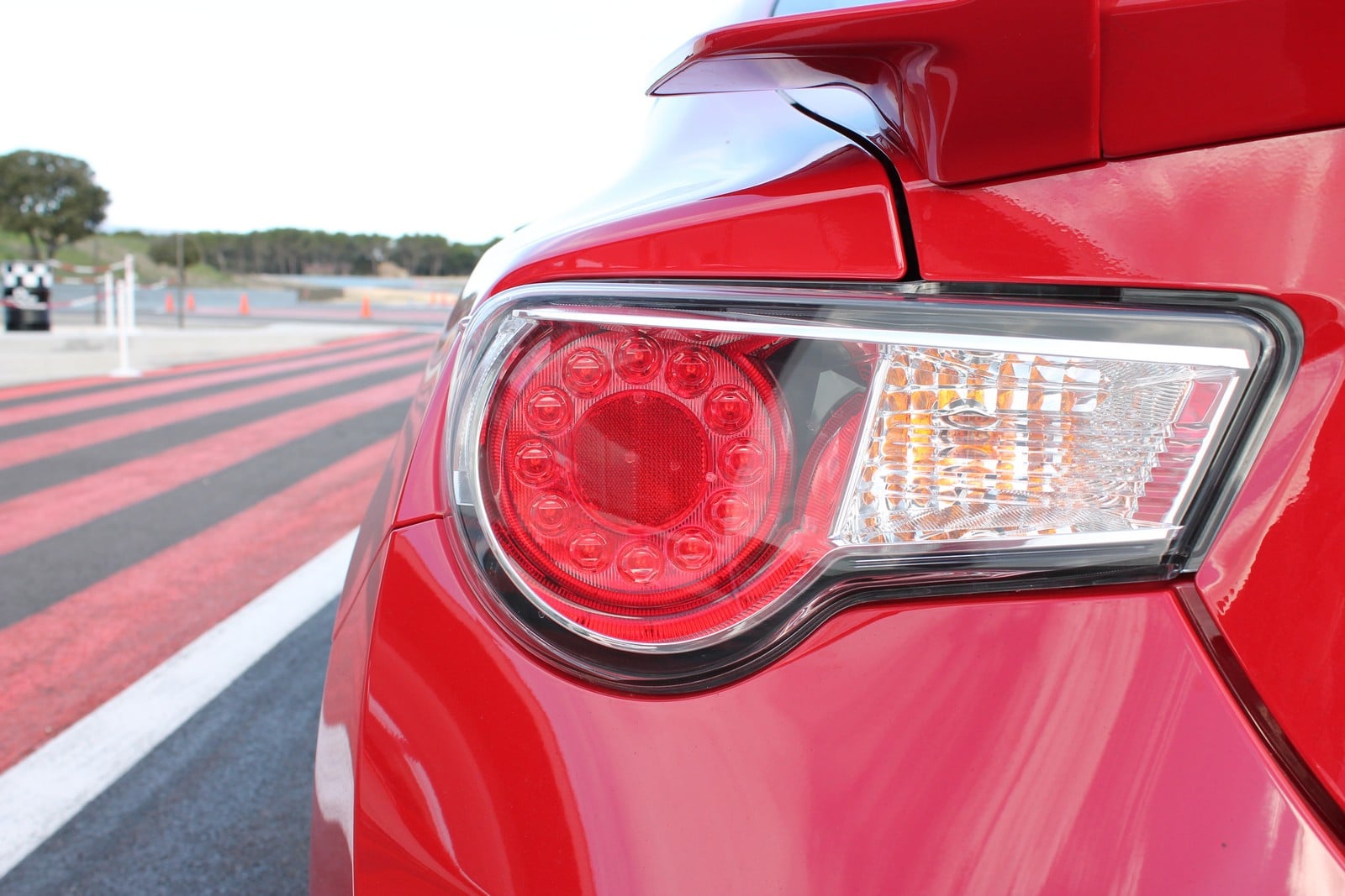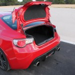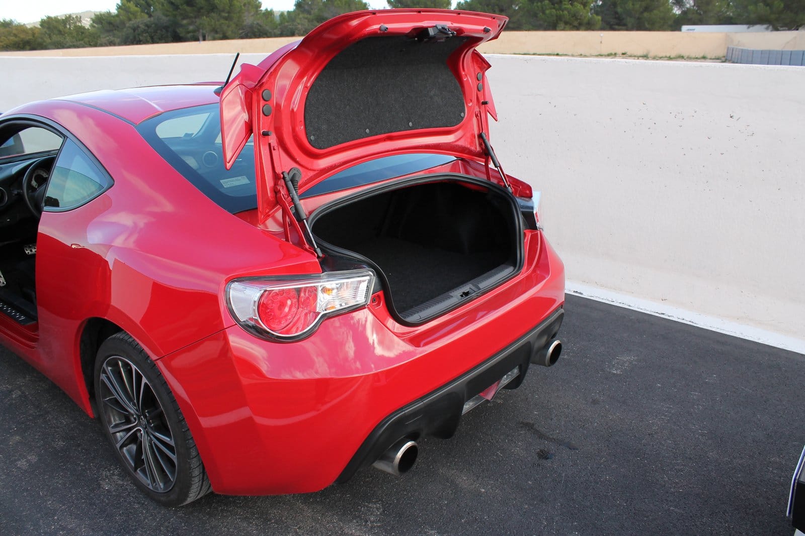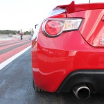 La partie arrière n’est pas en reste par rapport à la proue : des feux incrustés aux extrémités (la GT86 mesure 1,78 m de large) avec un dessin circulaire des feux stop qui donnent un air sportif très sympathique. L’aileron collé à la malle et la double sortie d’échappement droite gauche (de 86 mm !) donnent le ton