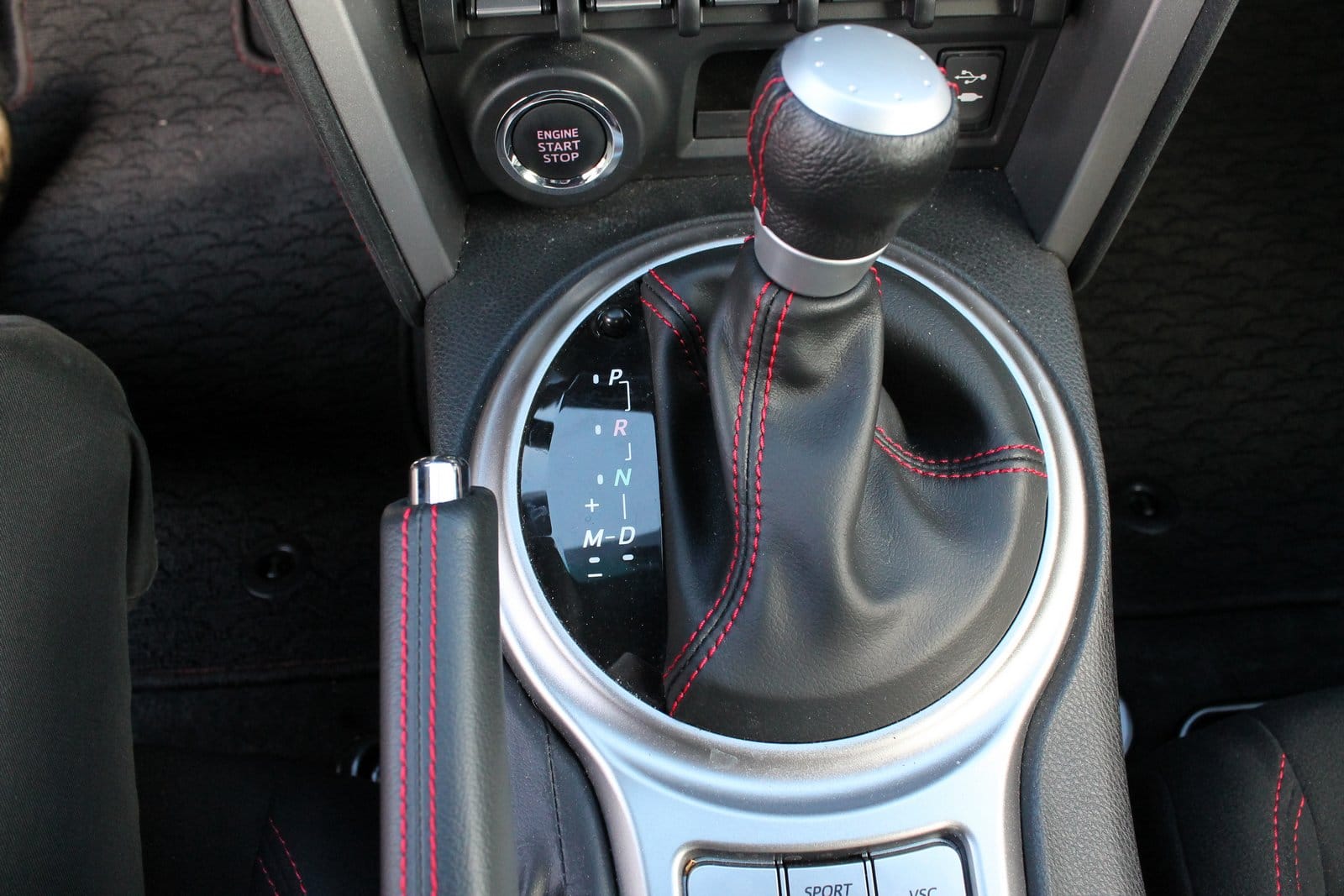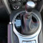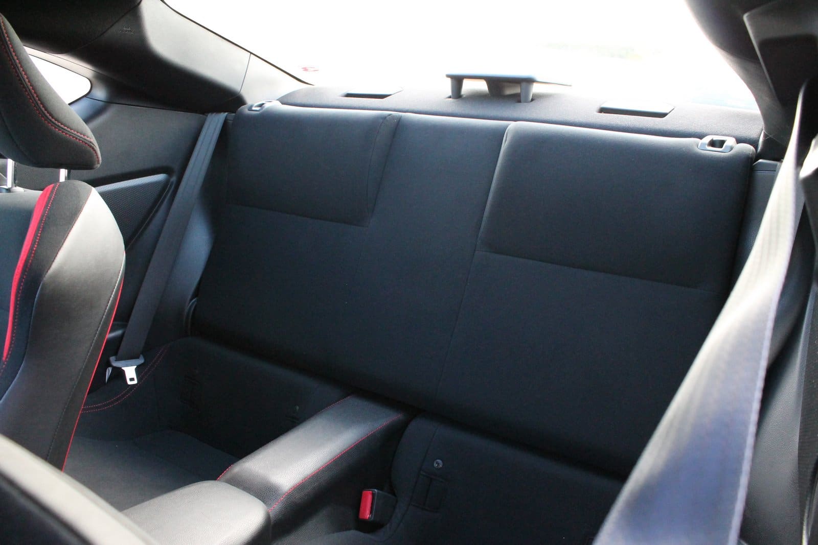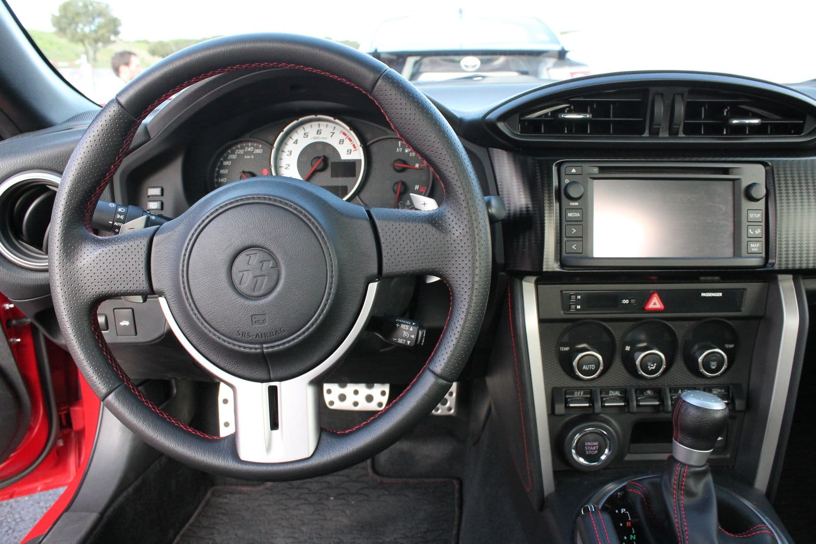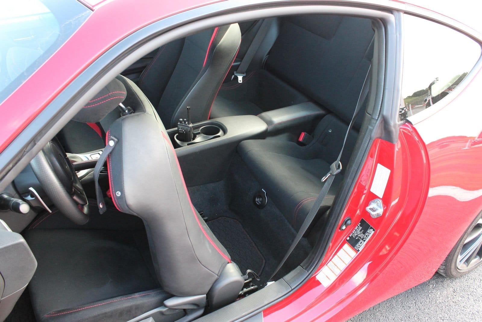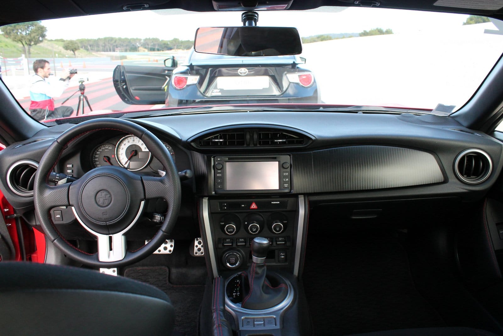 Lorsque l’on pénètre dans l’habitacle de la Toyota GT86, c’est une agréable surprise. On y trouve des sièges baquet bien enveloppants, de nombreuses surpiqures de couleur rouge (volant, pommeau de vitesse, …), une console centrale avec des boutons qui rappellent l’aviation, … Des imitations carbone se retrouvent sur la planche de bord et le fond des compteurs tu tableau de bord où trône fièrement en son centre un gros compte-tours.
