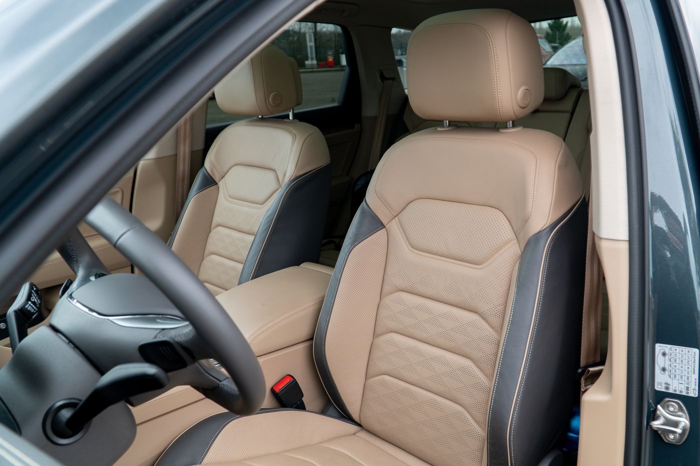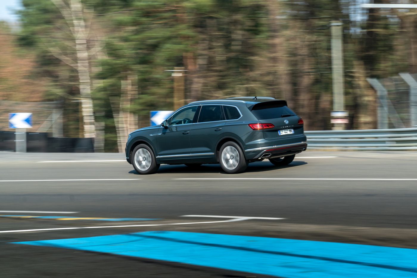 Heureusement pour l’utilisateur, elle est très réactive et agréable à manipuler, tandis que ses menus sont assez intuitifs pour retrouver facilement les fonctions les plus utilisées. Un temps d’apprentissage est toutefois nécessaire pour se familiariser avec les nombreuses possibilités de personnalisation afin de l’exploiter au mieux. L’ambiance à bord est feutrée et agréable, à tel point qu’on se croirait presque dans une voiture de luxe. Presque car même s’il est haut de gamme, le Touareg se montre un peu mesquin avec des plastiques durs peu flatteurs sur le bas des portes et de la console centrale. Pas de quoi se sentir mal à bord, mais le choix est étonnant et ne colle pas avec le reste de l’habitacle qui mélange cuir, bois et éclairage d’ambiance à LED. A l’avant comme à l’arrière, les passagers profitent de beaucoup de place et n’importe quel gabarit sera à son aise. Seule la place du milieu sur la banquette n’est pas des plus logeable, à cause du tunnel de transmission inhérent aux quatre roues motrices. Entre une sono Dynaudio de compétition qui crache 730 W (option à 1 820 €), un immense toit vitré, des prises USB à foison, le chargement à induction et la connectivité complète comprenant Android Auto et Car Play, les geeks seront comblés. De son côté, le coffre et ses 810 L de capacité permet à une famille de partir en vacances l’esprit tranquille.