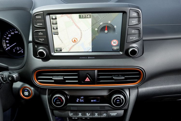 En effet, le Kona se dote d’un ensemble de systèmes d’aide à la conduite pour le conducteur et d’un bon combiné info-divertissement : on retrouve sur la planche de bord un écran de 8 pouces qui nous permet d’accéder aux fonctionnalités multimédia en toute quiétude, fluide, il ne révèle aucune difficulté particulière quant à son utilisation. L’affichage tête haute fait aussi son entrée tout comme un système multimédia à la pointe de la technologique associé à un système audio Krell !