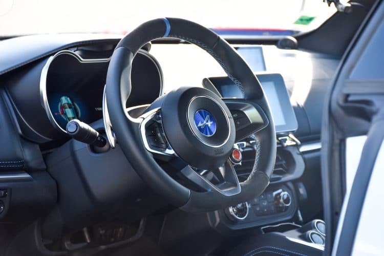 A l’intérieur, l’ambiance est au cocon sportif. L’A110 présente un habitacle plaisant et relativement soigné à première vue. Je ne me suis bien sûr pas penché sur les détails au vu des circonstances, mais l’ensemble est raccord. Les surpiqûres bleues me plaisent, ainsi que ce volant qui vous saute au visage avec un joli bouton « Sport » rouge. Seul l’écran tactile en plein milieu de la console centrale dénote quelque peu vis-à-vis du reste, mais l’heure est à la tech, et la tech passe énormément par un écran tactile en 2017/2018.