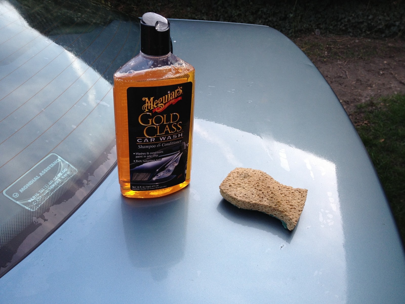 C’est donc le moment de prendre le jet d’eau pour asperger une première fois la voiture pour ensuite se saisir d’une éponge que l’on trempera dans une bassine d’eau mélangée au shampooing « Gold Glass ».