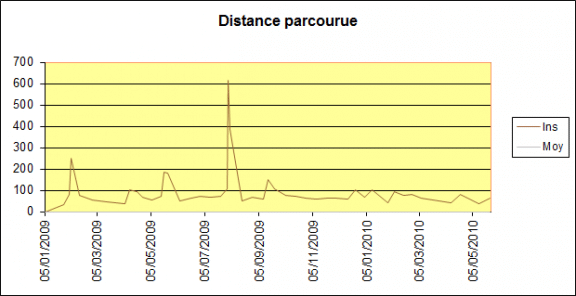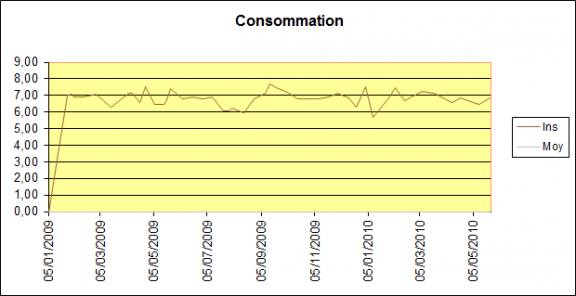 Si l’on calcule sa consommation en divisant le nombre de litres par le kilométrage effectué depuis le dernier plein, ça donne une courbe très chahutée. Ceci vient du fait qu’à chaque plein le réservoir est plus ou moins rempli.