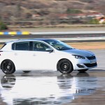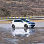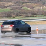 Pour cela, nous avons deux Peugeot 308 II. Une est équipée en Alpin 5 et la deuxième garde ses pneus été uniquement à l’arrière. Nous nous engageons sur une piste circulaire – que l’on pourrait comparer à un grand rond-point – offrant peu d’adhérence. A peine nous atteignons les 30 km/h que déjà la monte mixte (hiver + été) révèle un comportement peu sécurisant. En effet, le train arrière dévie et avec 10 – 15 km/h de plus, soit moins de 50 km/h (!), c’est une glisse sans fin que l’ESP s’efforce de corriger ! En désactivant le correcteur de trajectoire, il est impossible de faire un tour complet sans se rater.