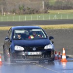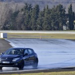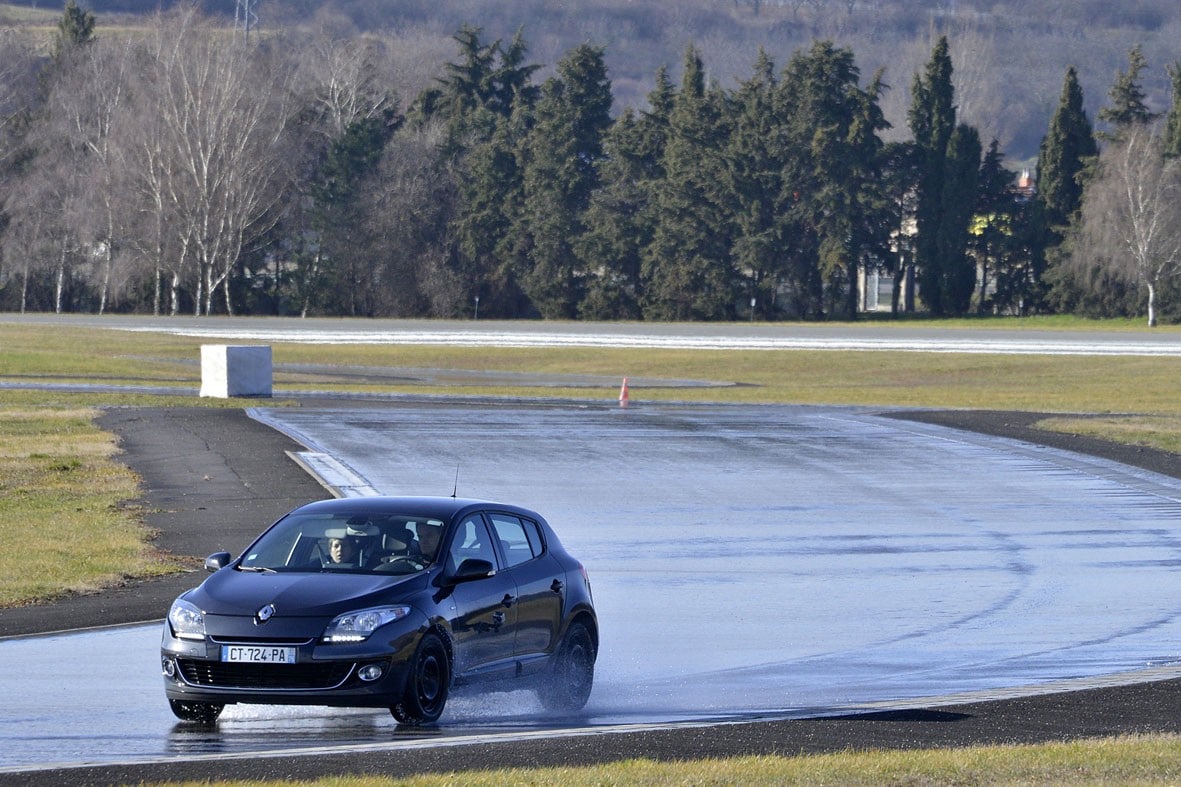 Nous partons donc avec des Renault Megane III. Si avec l’Alpin 5 il faut forcer le trait pour réellement déraper et sentir la voiture se dérober avant que l’ESP intervienne pour éviter le tête à queue, avec des gommes estivales la glisse est beaucoup plus prononcée, l’ESP est sollicité rapidement. On peut perdre la direction et tirer tout droit. Pour piloter en s’amusant ce n’est pas un problème, mais si c’est lors d’un freinage d’urgence dans un virage, l’écart ou pire, la perte de contrôle, sera nettement moins drôle.
