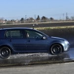 Pour ce premier atelier, il s’agit de comparer la distance de freinage entre un pneu hiver et un pneu été. Pour effectuer le test, nous lançon une Volkswagen Golf V à 70 km/h au régulateur. Il faut freiner à fond à partir d’un point précis (balise circulaire noire).