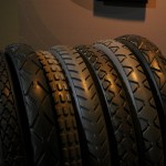 Quelques exemples de pneus Michelin. De droite à gauche : A380, camion de chantier, voiture, moto, vélo et même basket !