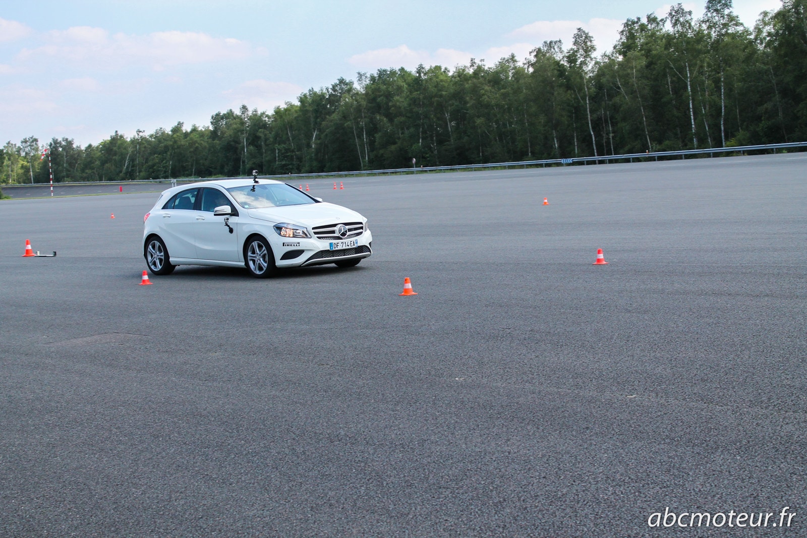 Pour la première tentative, nous passons la courbe en enfonçant la pédale d’accélérateur à moitié. Le véhicule ne subit aucune dérive dans le virage et pris par la confiance, nous écrasons la pédale sur la deuxième tentative. Comme sur le premier passage, la Mercedes garde son cap sans broncher et pour finir l’atelier, nous déconnectons l’ESP. Surprise, la Classe A ne bouge pas avec l’électronique déconnecté et la pédale d’accélérateur enfoncée.