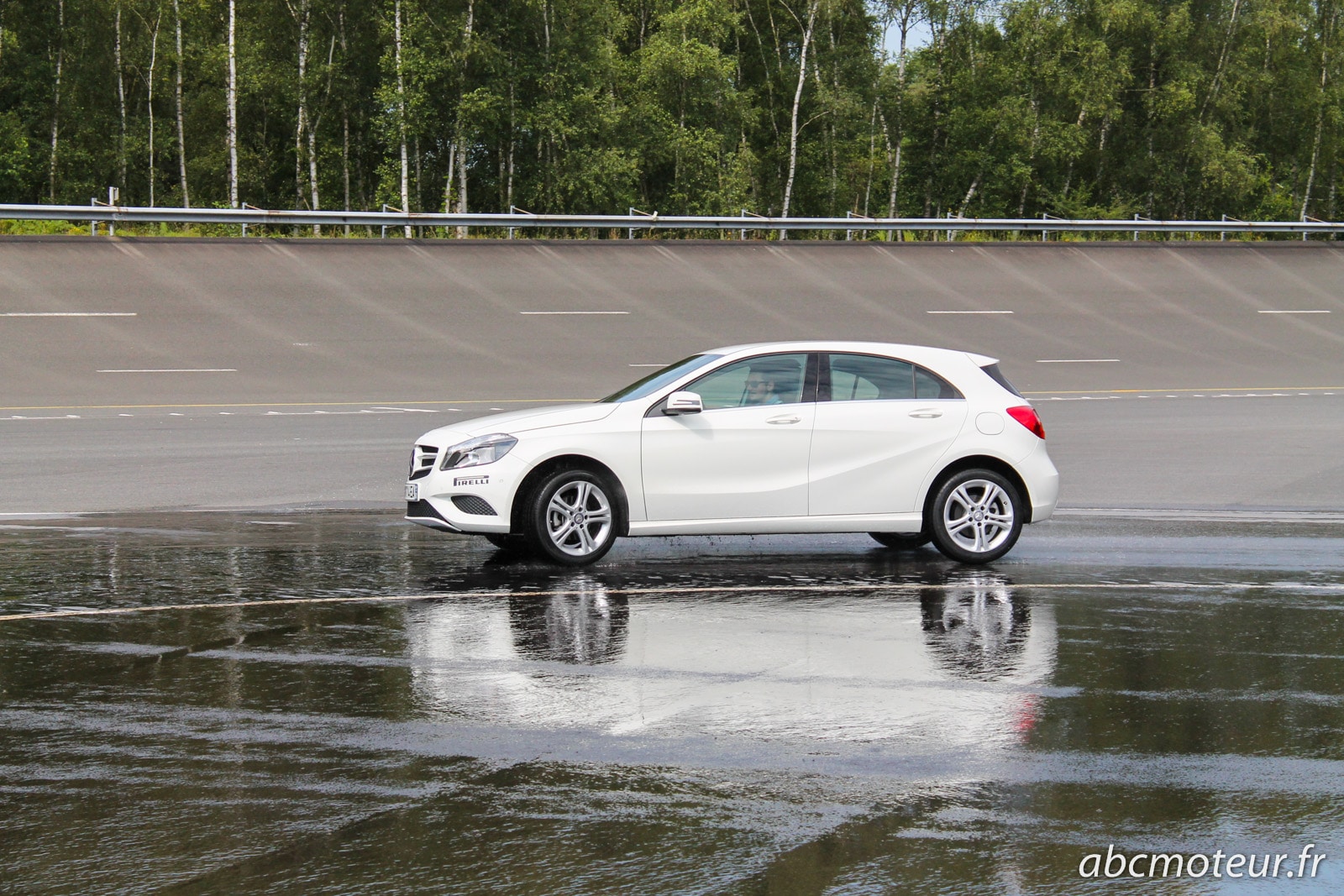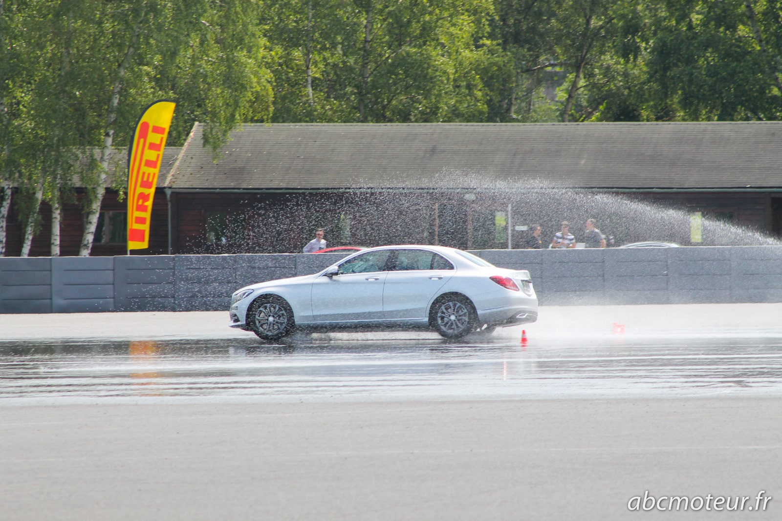 A bord d’une Mercedes Classe A équipée de Cinturato P7, nous arrivons sur l’aire plane où une courbe de 180° arrosée par des jets d’eau nous attend. Le but de cet atelier est de constater la motricité du véhicule sur une surface très glissante.