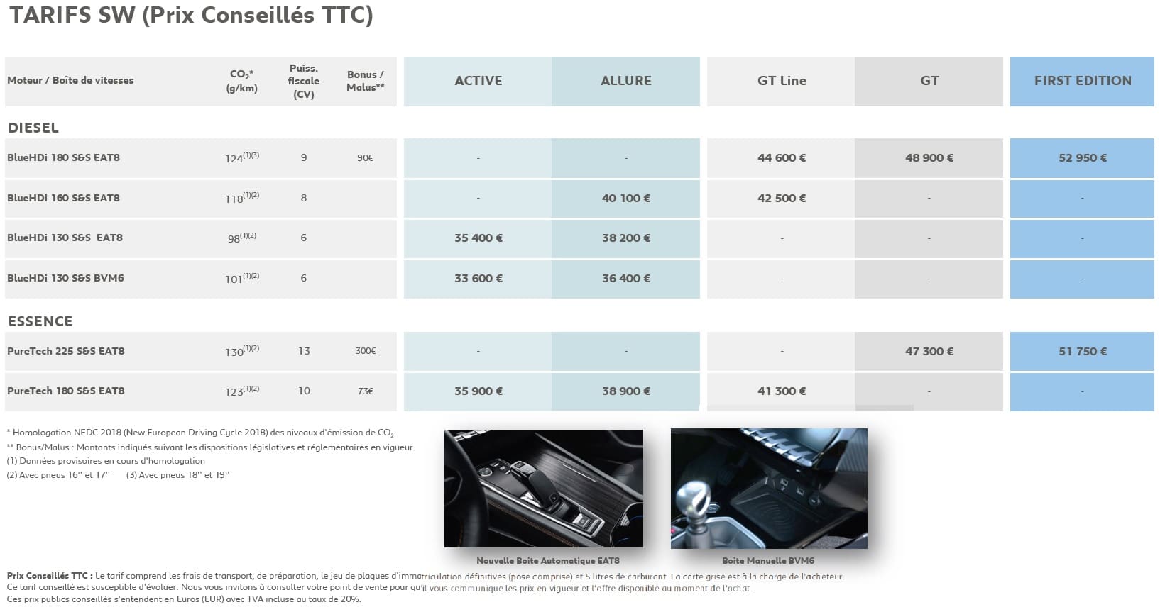 Les prix s’échelonnent de 24 750€ pour l’entrée de gamme équipée du moteur 1.6 VTI de 120 chevaux en finition Access, à 40 700€ pour le modèle 2.2 HDI 200 BVA en finition GT. L’entrée de gamme augmente de 150€, Peugeot justifie cette hausse par l’arrivée de feux de jour à LED et du contrôle de pression des pneumatiques, la finition Active sera facturée quant à elle 400€ de plus en raison d’un nouveau système multimédia (écran tactile de 7 pouces, clé 3G, streaming, connexion tablettes, téléphones…), mais la hausse la plus forte se fait sur les finitions haut de gamme Féline et GT qui augmentent de 900€ (1150€ en version SW). Elles reçoivent en plus de l’ancienne version : des feux à LED, la surveillance des angles morts et une caméra de recul.