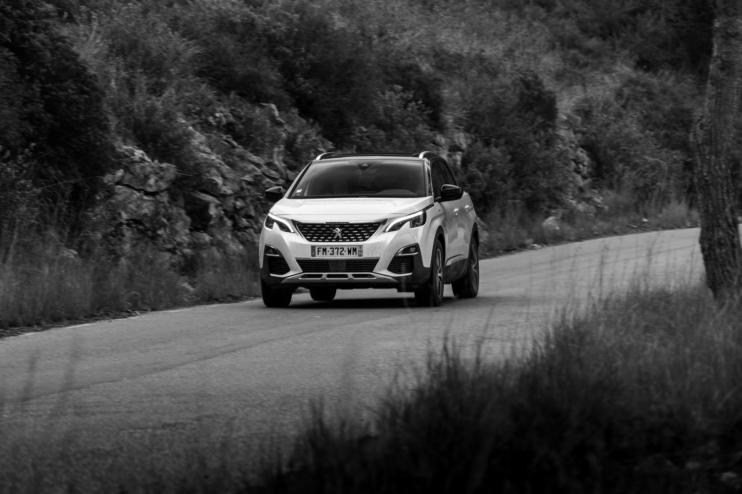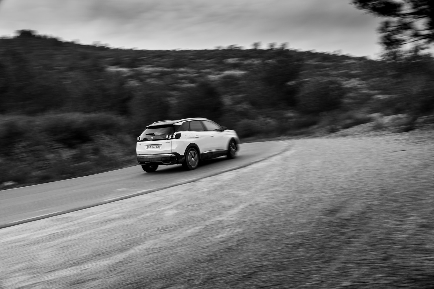Sur route, les changements sont toutefois plus marqués. En effet, technologiquement parlant, les deux Peugeot sont un peu différentes. La 508 embarque un moteur électrique en plus du thermique et reste donc une simple traction, avec 225 ch de puissance cumulée. De son côté, le 3008 embarque pour sa part deux moteurs électriques en plus du thermique, l’un d’eux se chargeant de mouvoir les roues arrière. Cet ajout le transforme en quatre roues motrices, tandis que la puissance cumulée atteint 300 ch. Disons-le d’emblée, le 3008 accélère fort, plus fort que ce que l’on attendrait d’un SUV compact sans velléité sportive. C’est bien de ça qu’il faut se rappeler, tant il est facile de se laisser griser par les chiffres. 300 ch peut-être, mais ni les freins ni le châssis ne sont pensés pour exploiter dynamiquement cette puissance, car le poids vient jouer les trouble fêtes. Avec le système hybride ce ne sont pas moins de 345 kg supplémentaires qu’il faut gérer, et cela se ressent immédiatement en virage.